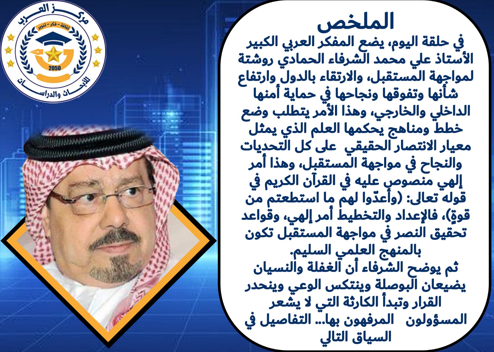 في حلقة اليوم، يضع المفكر العربي الكبير الأستاذ علي محمد الشرفاء الحمادي، روشتة لمواجهة المستقبل، والارتقاء بالدول وارتفاع شأنها وتفوقها ونجاحها في حماية أمنها الداخلي والخارجي، وهذا الأمر يتطلب وضع خطط ومناهج يحكمها العلم الذي يمثل معيار الانتصار الحقيقي على كل التحديات والنجاح في مواجهة المستقبل، وهذا أمر إلهي منصوص عليه في القرآن الكريم بقوله تعالى: “وأعدّوا لهم ما استطعتم من قوةٍ”، فالإعداد والتخطيط أمر إلهي، وقواعد تحقيق النصر في مواجهة المستقبل تكون بالمنهج العلمي السليم.