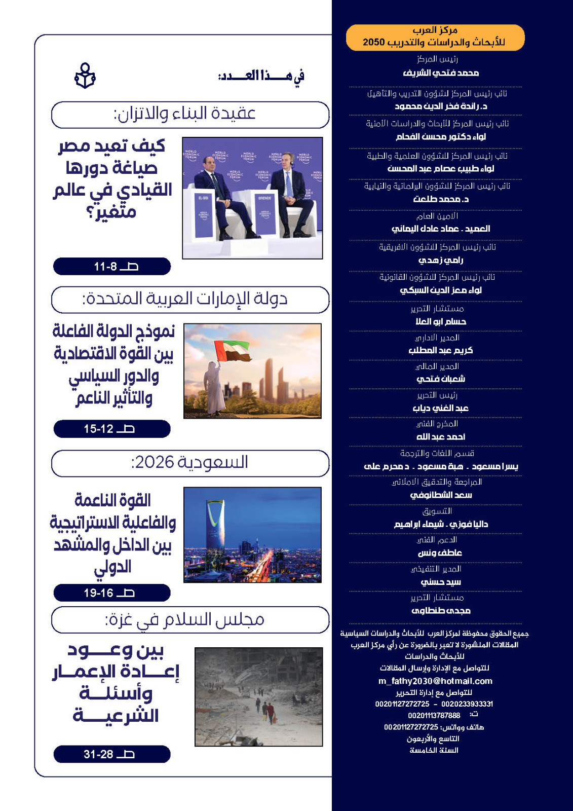 ويستعرض هذا التقرير أبرز ما جاء في العدد، مع تحليل استراتيجي للمقالات والتقارير التي غطت شؤون مصر، والإمارات، والسعودية، وليبيا، والسودان، والكويت، بالإضافة إلى الملف الشائك حول “مجلس السلام في غزة”، مع عمل قراءة لأطروحات الشرفاء الحمادي التي تمثل العمود الفقري لهذا الإصدار.