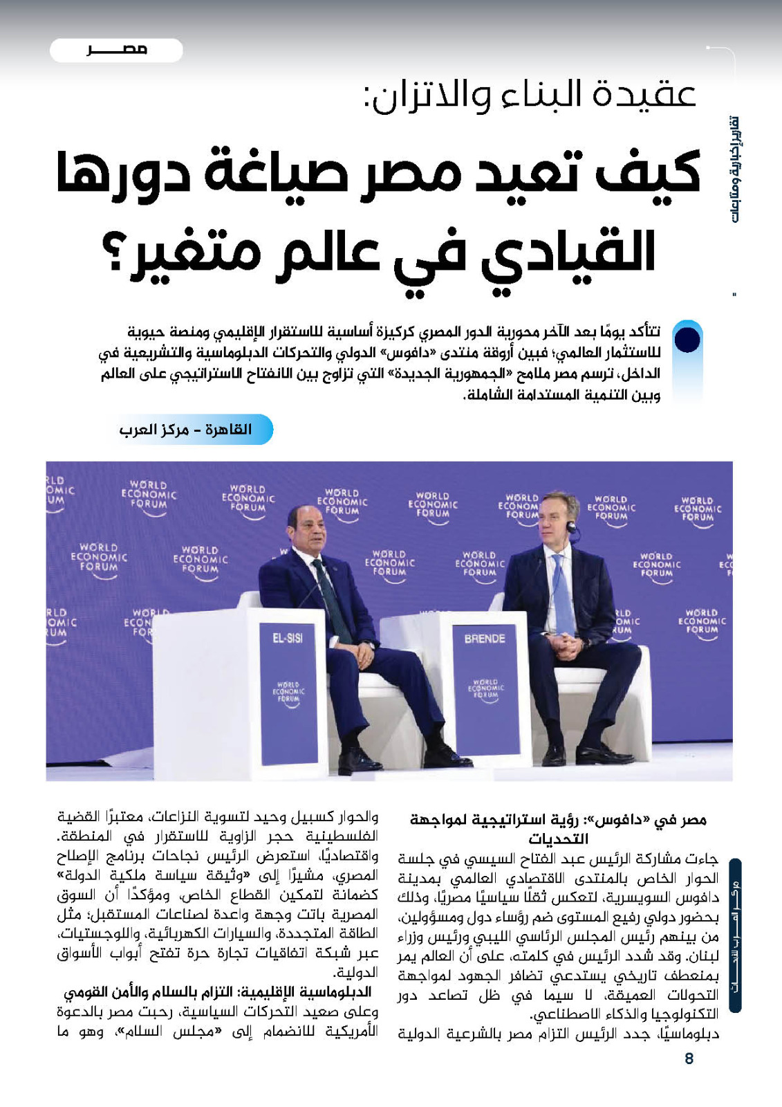 يستعرض العدد في ملفه المصري كيف تعيد القاهرة صياغة دورها القيادي في عالم متغير، مركزاً على مشاركة الرئيس عبد الفتاح السيسي في منتدى “دافوس” الاقتصادي بسويسرا. تعكس هذه المشاركة ثقلاً سياسياً مصرياً، حيث استعرض الرئيس نجاحات برنامج الإصلاح الاقتصادي، مشيراً إلى “وثيقة سياسة ملكية الدولة” كضمانة لتمكين القطاع الخاص.
