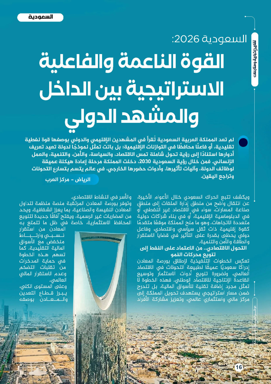 ويرصد العدد التحولات الكبرى في المملكة العربية السعودية، مؤكداً أنها دخلت مرحلة إعادة هيكلة عميقة لوظائف الدولة وأدوات حضورها الخارجي استناداً إلى “رؤية 2030”. ويبرز التقرير إطلاق “بورصة المعادن” كخطوة استراتيجية لتنويع الاقتصاد، حيث تشير التقديرات إلى ارتفاع مساهمة قطاع التعدين في الناتج المحلي الإجمالي من 17 مليار دولار في 2024، إلى 75 مليار دولار بحلول 2030.