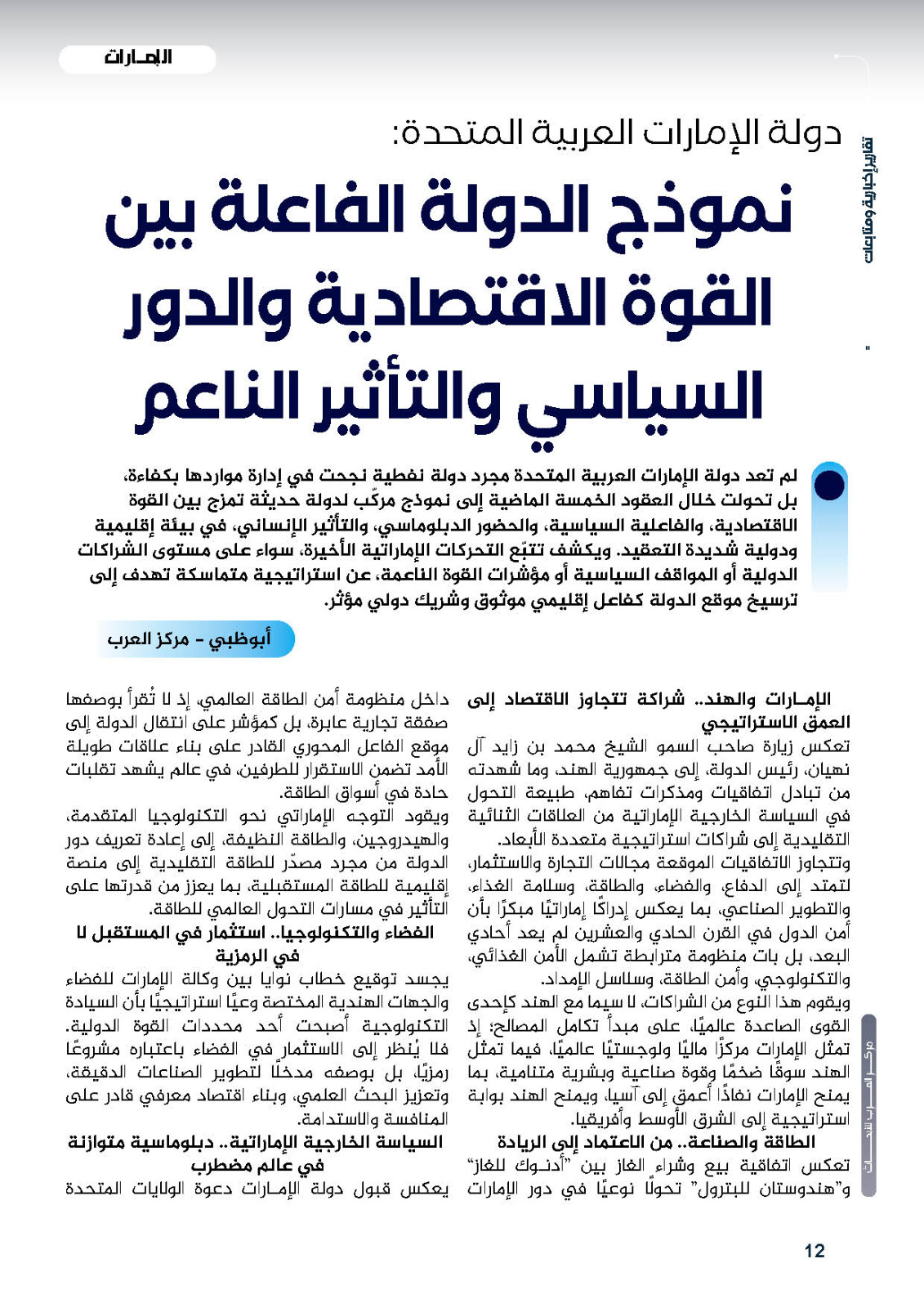 ينتقل العدد إلى تحليل التجربة الإماراتية، واصفاً إياها بأنها لم تعد مجرد دولة نفطية، بل تحولت إلى نموذج حديث يمزج بين القوة الاقتصادية والفاعلية السياسية والحضور الإنساني. ويبرز التقرير زيارة الشيخ محمد بن زايد آل نهيان إلى الهند كتحول استراتيجي يعكس انتقال السياسة الخارجية الإماراتية نحو شراكات متعددة الأبعاد؛ تشمل الدفاع والفضاء والطاقة وسلاسل الإمداد. وتشير البيانات الواردة في العدد إلى أن الإمارات حلت ضمن أفضل عشر دول عالمياً في مؤشر القوة الناعمة لعام 2026.
