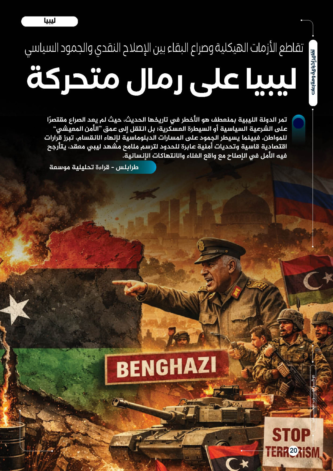 ويقدم العدد قراءة تحليلية موسعة للأوضاع في ليبيا والسودان، واصفاً إياها بأنها تمر بمنعطفات هي الأكثر خطورة في تاريخها المعاصر، حيث تعيش ليبيا بين الجمود السياسي والأمن المعيشي، وتمر بمنعطف حاد، حيث انتقل الصراع من الشرعية السياسية إلى “الأمن المعيشي” للمواطن.