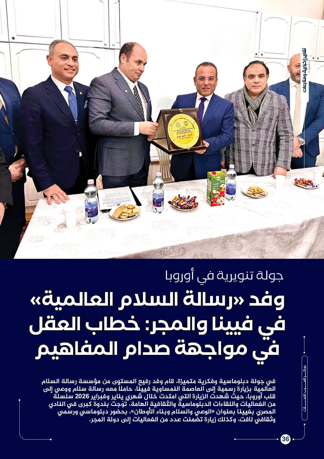 ويرصد العدد النجاح الكبير لجولة وفد مؤسسة “رسالة السلام العالمية” في فيينا والمجر خلال شهري يناير وفبراير 2026، إذ هدفت الجولة إلى تقديم رؤية عربية إسلامية مستنيرة للتعايش والسلام، انطلاقاً من أفكار المفكر علي محمد الشرفاء الحمادي. وفي فيينا، زار الوفد مقر الأمم المتحدة وأهدى المسؤولين نسخاً مترجمة للغة الألمانية من مؤلفات الشرفاء الحمادي، التي تركز على تصحيح المفاهيم وبناء أسس متينة للتفاهم الإنساني.