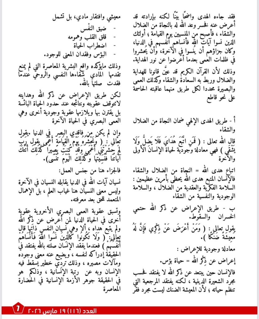 ويأتي مقال «ما قلَّ ودلَّ» في هذا العدد بوصفه امتدادًا منهجيًا وروحيًا لأطروحة الشرفاء، إذ ينقل النقاش من نقد التراث إلى بيان أثر الهداية القرآنية في بناء النفس والوعي والمصير. ويركز المقال على أن الدعوة إلى الله لا تقوم إلا على البصيرة، وأن الإنسان حين يُعرض عن هدى الله يدخل في مسار النسيان والضياع، بينما يكون اتباع الوحي طريق النجاة من الضلال والشقاء. كما يتتبع المقال أسباب السقوط في نسيان الله، من اتباع الهوى والغفلة والاستكبار وصحبة السوء والانشغال بزينة الدنيا، ليؤكد في النهاية أن البصائر القرآنية هي النور الذي يخرج الإنسان من ظلمات الغفلة إلى نور الهداية.