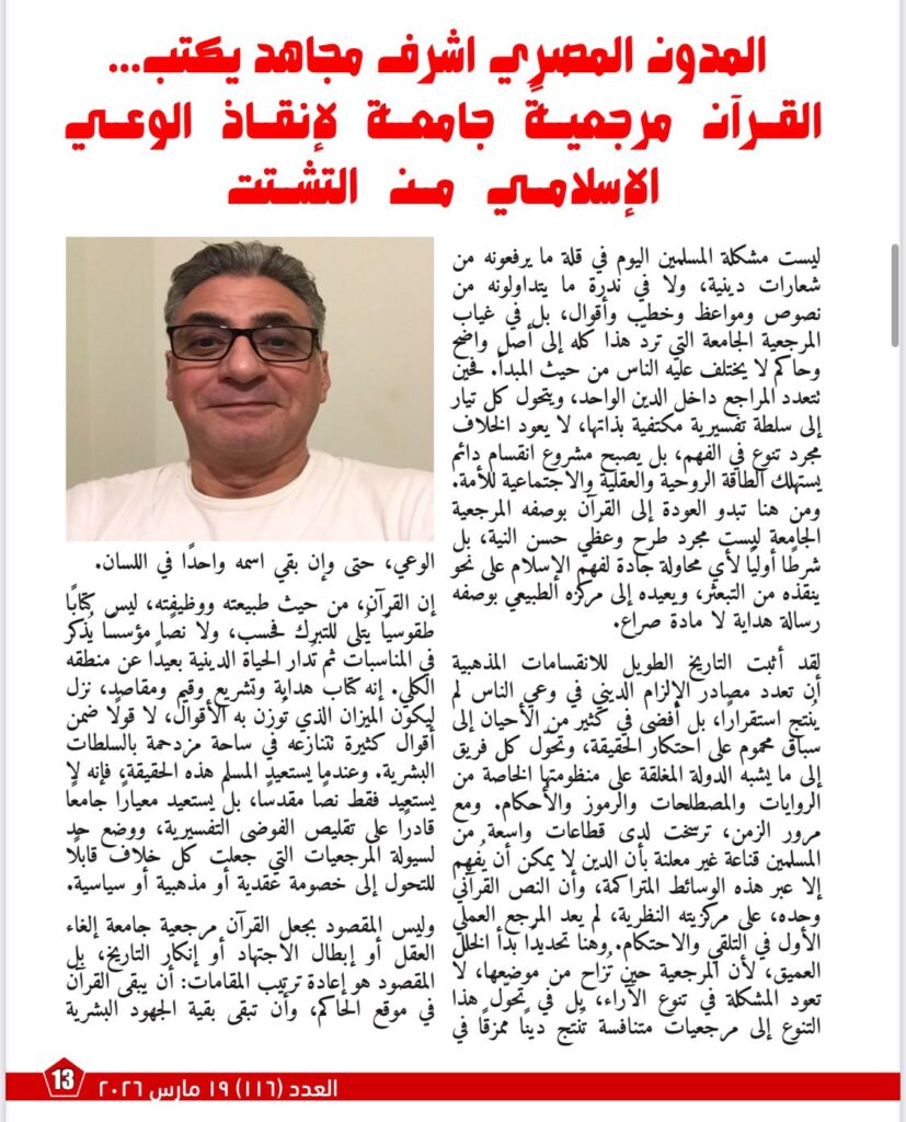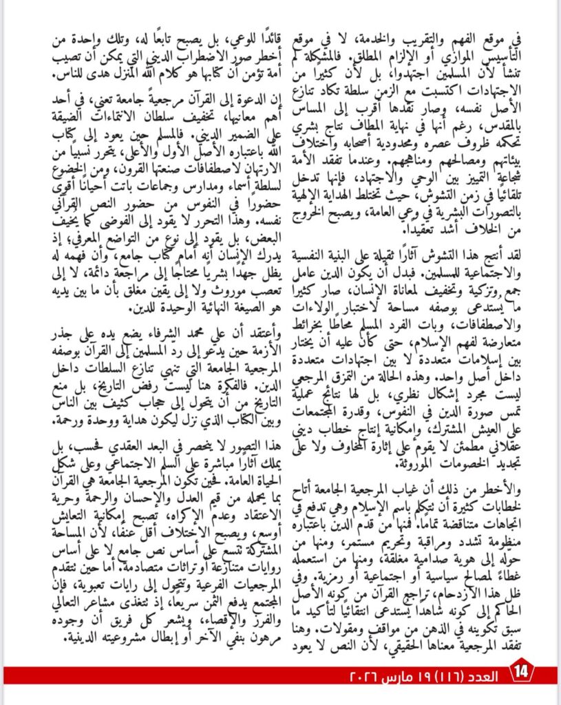 بينما يركز مقال «القرآن مرجعيةً جامعة لإنقاذ الوعي الإسلامي من التشتت» على أن أزمة المسلمين اليوم لا تكمن في قلة الخطاب الديني، بل في غياب المرجعية الجامعة التي تردّ الخلافات إلى أصل حاكم وواضح. ويؤكد أن جعل القرآن المرجعية الأولى يعيد ضبط العلاقة بين الوحي والاجتهاد، ويخفف من سطوة المرجعيات الفرعية، ويفتح الباب أمام فهم أكثر اتزانًا للإسلام بوصفه رسالة وحدة ورحمة وعدل.