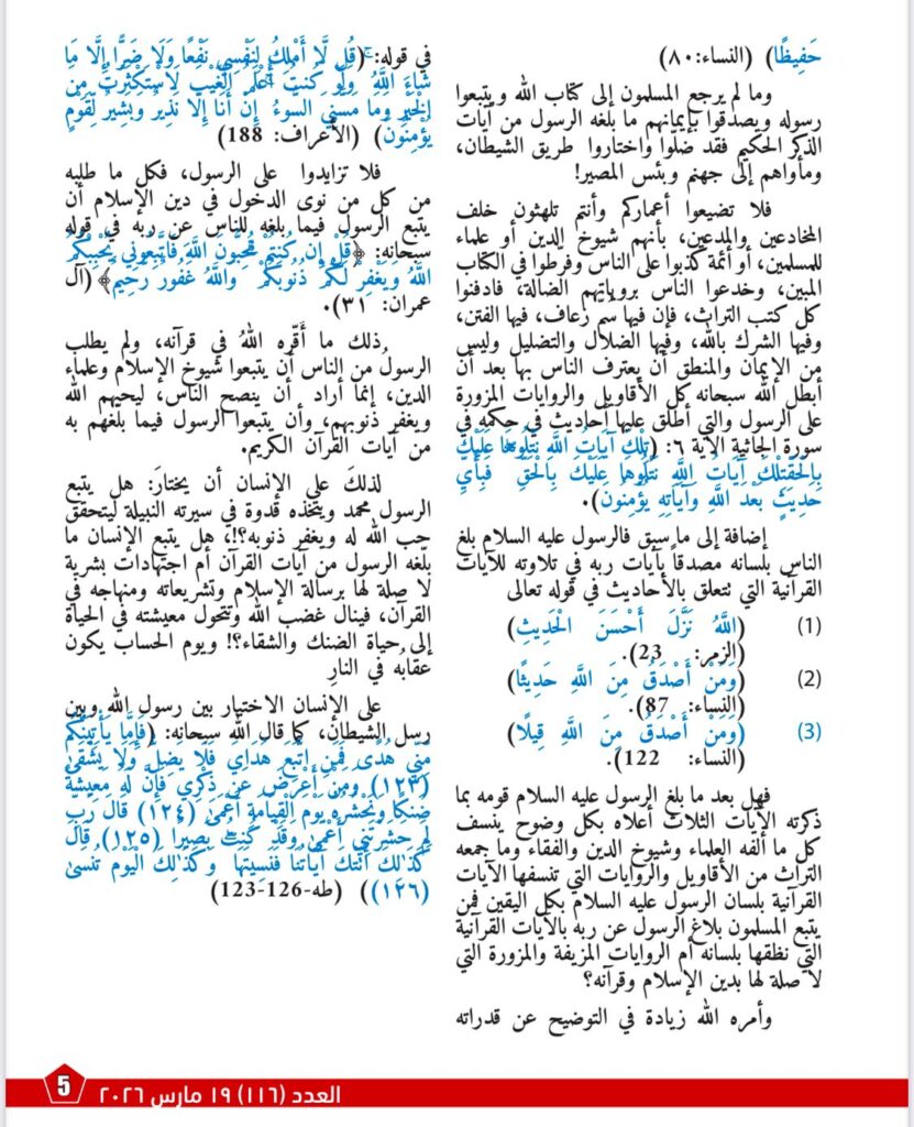 تضمن العدد مناقشة مقال المفكر العربي الاستاذ علي محمد الشرفاء الحمادي بعنوان «الغارقون في التراث»، في معالجة تحريرية تعكس توجه المجلة نحو فتح نقاش معرفي رصين حول قضايا الوعي الديني، ومرجعية القرآن الكريم، وحدود العلاقة بين النص الإلهي والموروث البشري، وأثر ذلك كله في واقع المسلمين المعاصر.