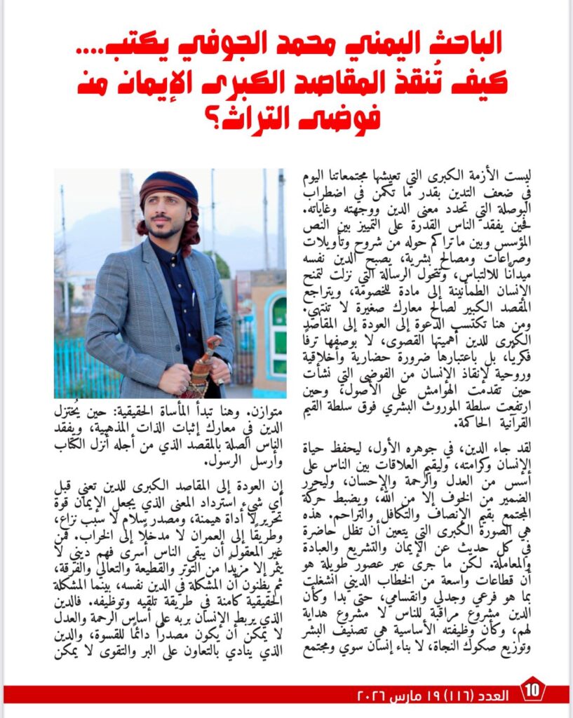 ويناقش مقال «كيف تُنقذ المقاصد الكبرى الإيمان من فوضى التراث؟» حيث يوضح كيف أدى انصراف الوعي الديني عن مقاصده الكبرى إلى تحويل الدين من رسالة هداية إلى ساحة خصومات وصراعات. ويركز على أن العودة إلى المقاصد العليا للدين تمثل ضرورة حضارية وأخلاقية، لأنها تعيد ترتيب الأولويات على أساس الرحمة والعدل والكرامة والحرية، وتخضع كل ما يقال باسم الدين لمعيار القرآن وغايته في إصلاح الإنسان والمجتمع.