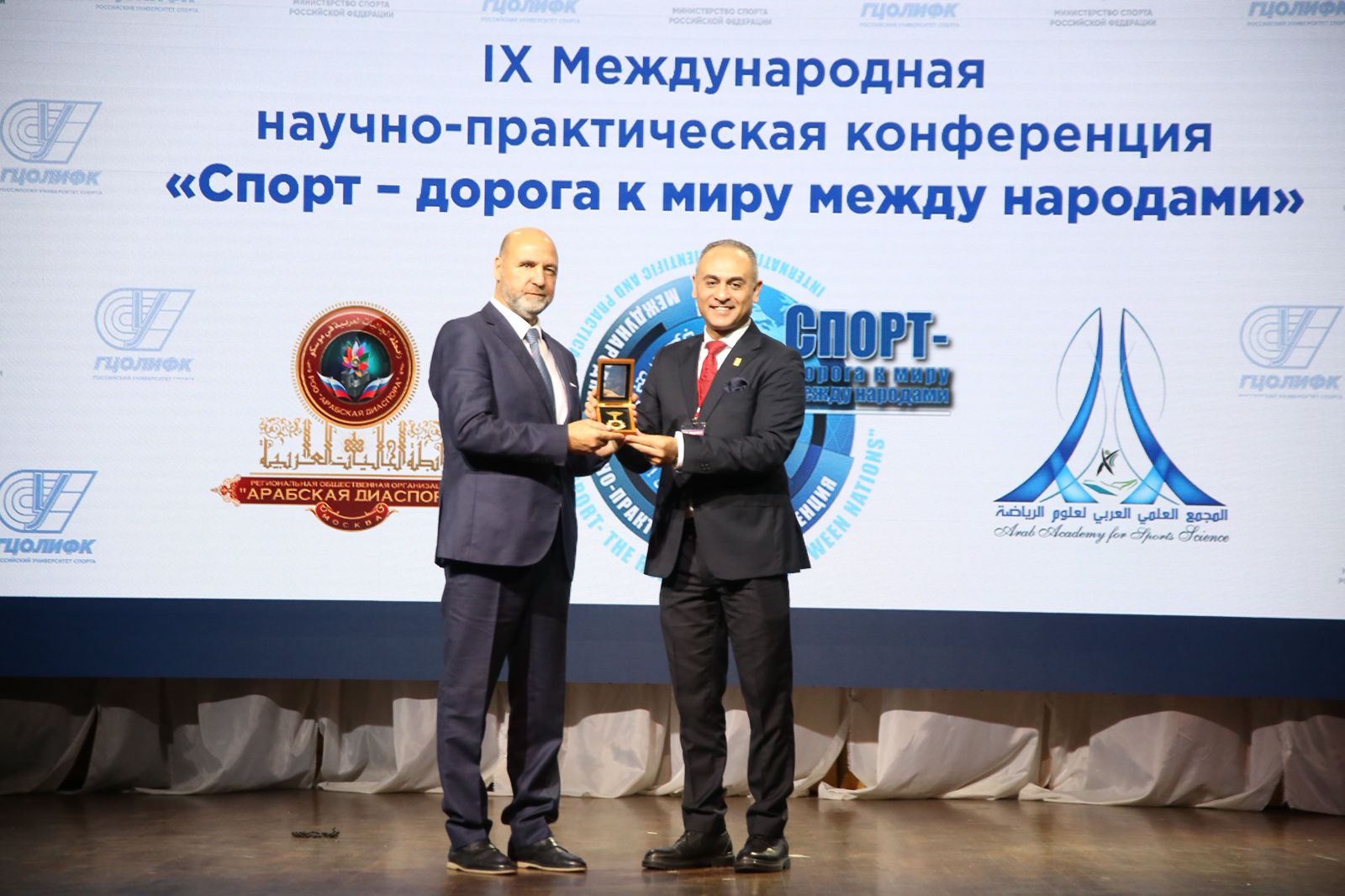 قدم البروفيسور محمد يحيى غيدة، الأستاذ بجامعة المنصورة، درع جامعة المنصورة، الدكتور حسان نصر الله، رئيس اللجنة المنظمة للمؤتمر العلمي العملي الدولي «الرياضة طريق إلى السلام بين الشعوب».