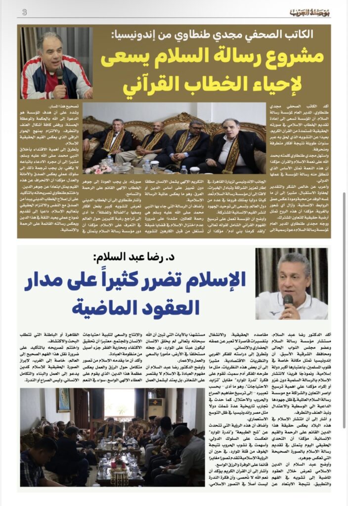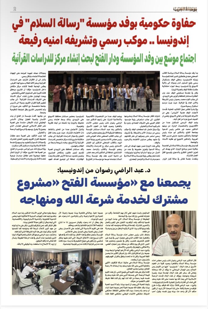 ومن أبرز موضوعات العدد، تقرير موسع بعنوان “حفاوة حكومية بوفد مؤسسة رسالة السلام في إندونيسيا”، يرصد تفاصيل الزيارة الرسمية وما شهدته من استقبال رفيع المستوى، ويستعرض جهود المؤسسة في تعزيز قيم السلام والتعايش، إلى جانب تغطية لقاءاتها مع المؤسسات العلمية والدعوية، ومناقشة مشروع إنشاء مركز للدراسات القرآنية، في إطار توسيع آفاق التعاون الثقافي والفكري.