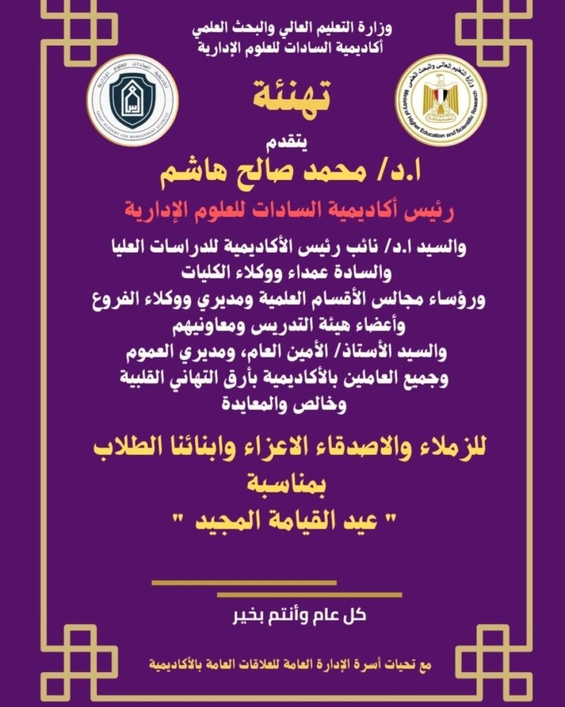 تقدم الأستاذ الدكتور محمد صالح هاشم، رئيس أكاديمية السادات للعلوم الإدارية، بأرق التهاني وأطيب الأمنيات إلى الزملاء وأعضاء هيئة التدريس، والأصدقاء الأعزاء، وأبنائه الطلاب من الإخوة الأقباط، وذلك بمناسبة الاحتفال بعيد القيامة المجيد.