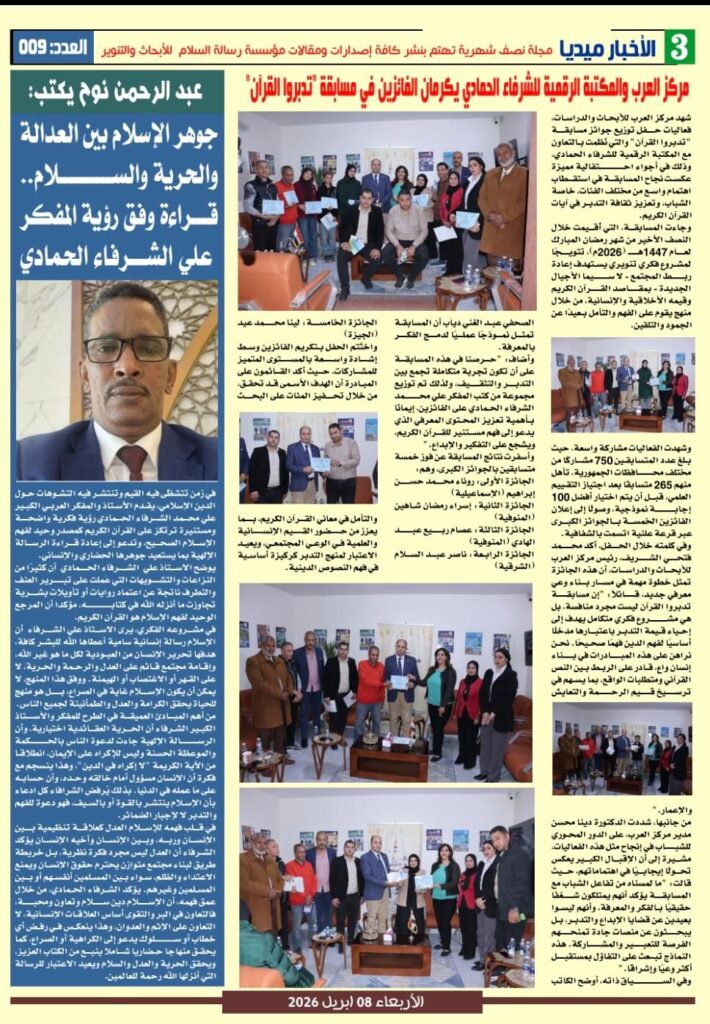 كما تضمن العدد نشاط مركز العرب والمكتبة الرقمية، خاصة تنظيم مسابقة “تدبروا القرآن”، والتي انتهت بتكريم الفائزين، في خطوة تستهدف تعزيز الفهم الواعي للنص الديني بعيدًا عن التلقين.
