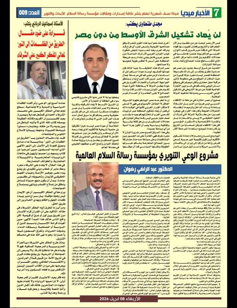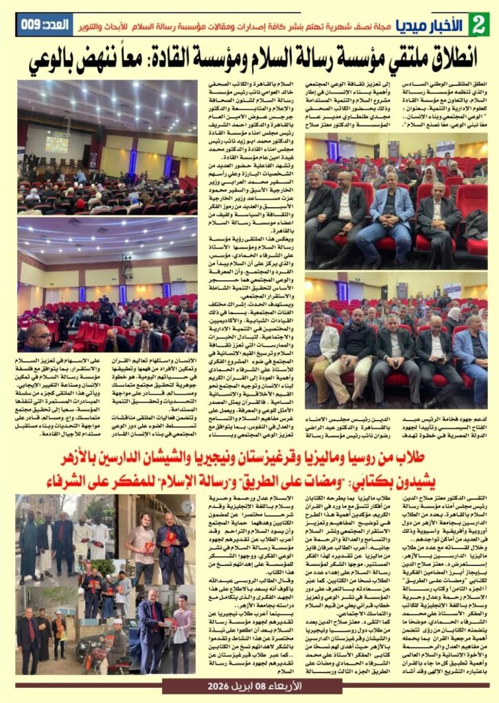 كما تضمن العدد تغطية لفعاليات ملتقى مؤسسة رسالة السلام ومؤسسة القادة تحت شعار “معًا ننهض بالوعي”، حيث شهد الملتقى حضورًا لافتًا ونقاشات حول دور الإعلام، التعليم، والخطاب الديني في تشكيل الوعي المجتمعي.
