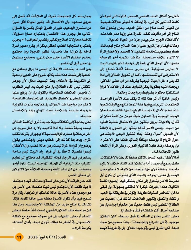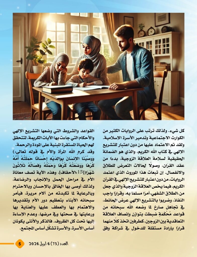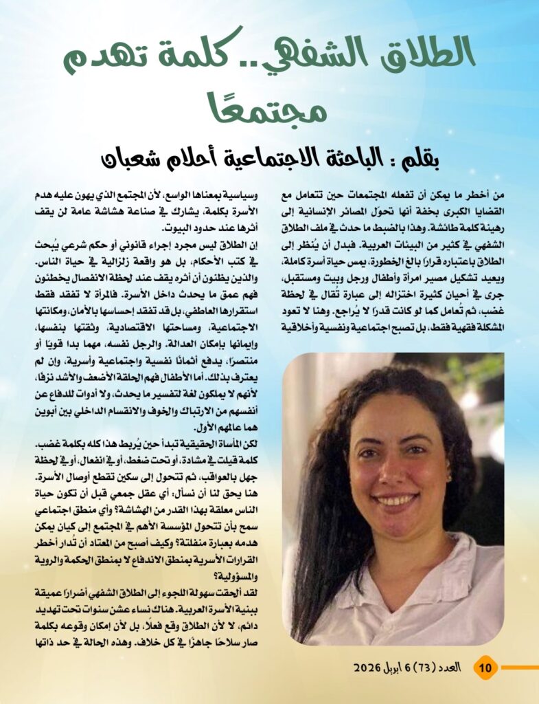 كما يركّز المقال على ما ترتب على بعض الفتاوى والممارسات الشائعة، وفي مقدمتها الطلاق الشفهي، من آثار خطيرة أسهمت في تفكك الأسر وتشرد الأطفال وإضعاف البنية الأخلاقية للمجتمع. ويعيد المقال توجيه النقاش إلى أهمية الاحتكام إلى التشريع الإلهي في صون العلاقة بين الزوجين، وحماية الأم، وتعظيم دور المرأة باعتبارها شريكًا أصيلًا في بناء الأسرة وصناعة المجتمع، لا طرفًا هامشيًا أو تابعًا.