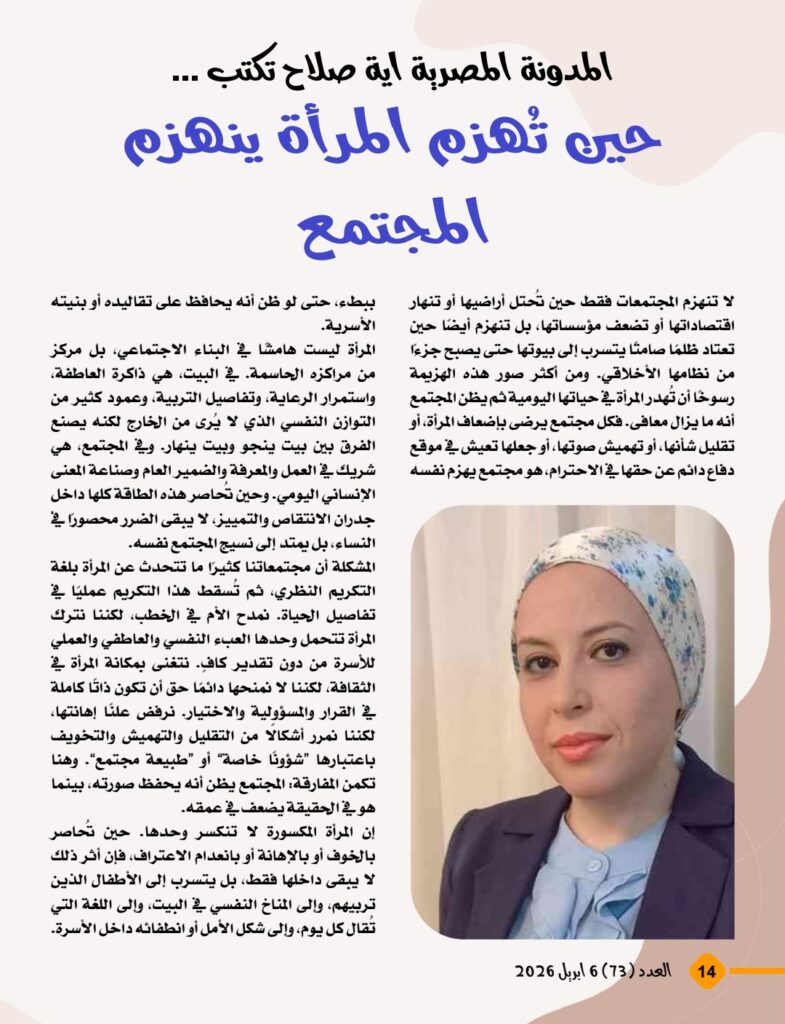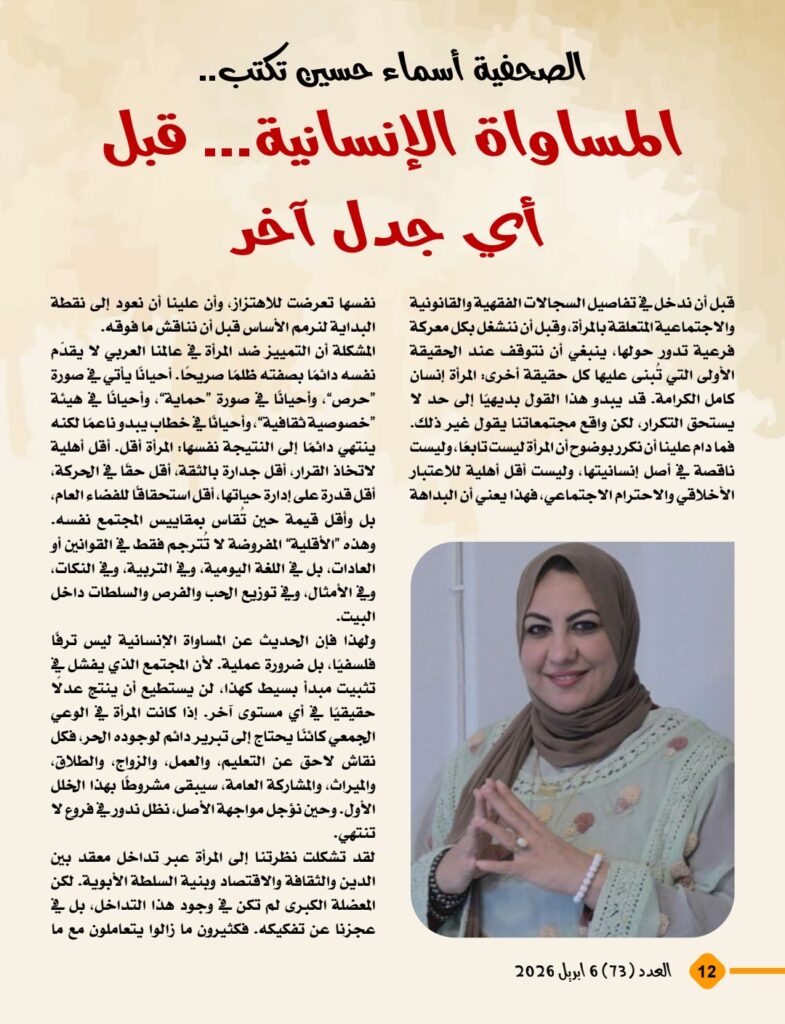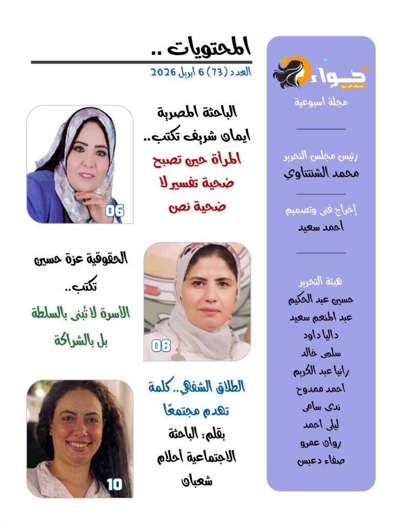ويضم العدد مجموعة من المقالات المتفاعلة مع هذا الطرح، من بينها: «المرأة حين تصبح ضحية تفسير لا ضحية نص»، و«الأسرة لا تُبنى بالسلطة بل بالشراكة»، و«الطلاق الشفهي… كلمة تهدم مجتمعًا»، و«المساواة الإنسانية… قبل أي جدل آخر»، و«حين تُهزم المرأة ينهزم المجتمع»، و«تكريم الأم ليس خطابًا عاطفيًا بل مشروع حضاري»