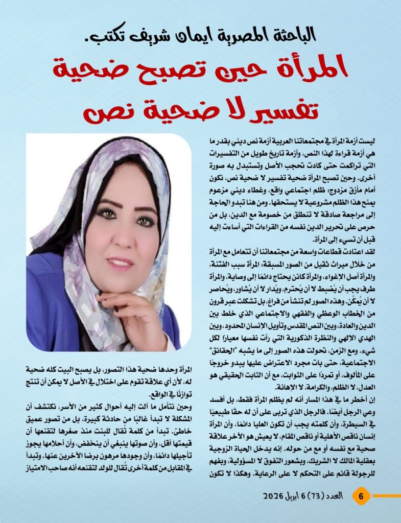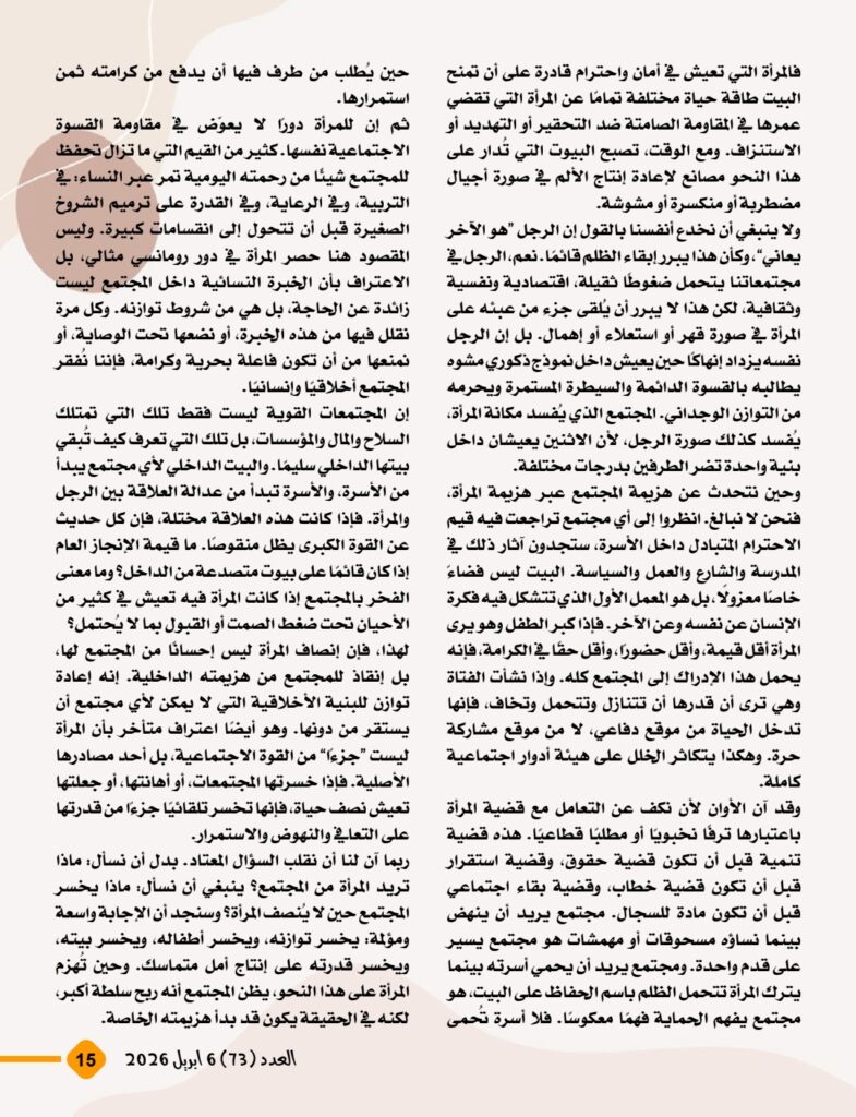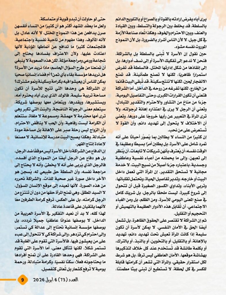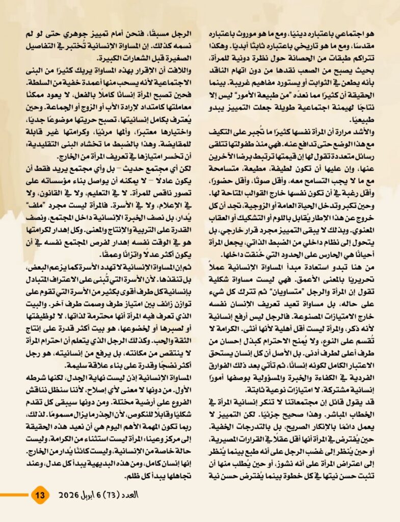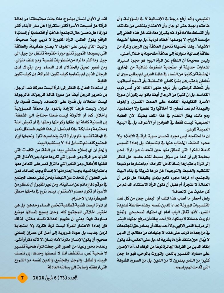 ويطرح المفكر العربي علي محمد الشرفاء الحمادي في مقاله الرئيسي رؤية نقدية واضحة للمفاهيم الموروثة التي أسهمت، عبر قراءات بشرية وتفسيرات غير منصفة، في تكريس نظرة دونية إلى المرأة وإضعاف مكانتها داخل الأسرة والمجتمع. ويؤكد المقال أن المرجعية القرآنية جاءت لتقر المساواة الإنسانية، وتحفظ للمرأة كرامتها وحقوقها، وتمنع أن تتحول العلاقة الزوجية إلى مساحة للهيمنة أو الاستبداد، بما يضمن بناء الأسرة على الرحمة والعدل والتكافل.