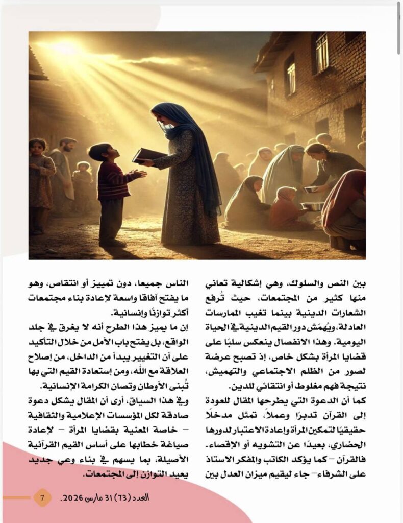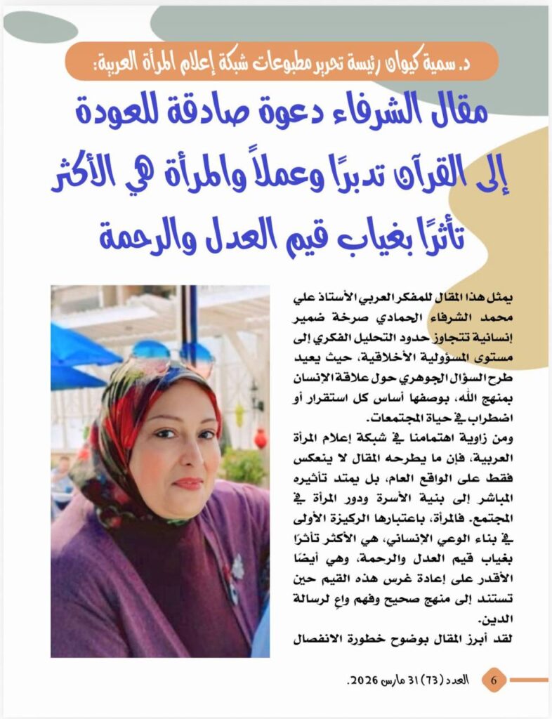 -د. سمية كيوان رئيسة تحرير مطبوعات شبكة إعلام المرأة العربية:مقال الشرفاء دعوة صادقة للعودة إلى القرآن تدبرا وعملا ..والمرأة هى الأكثر تأثرا بغياب قيم العدل والرحمة
