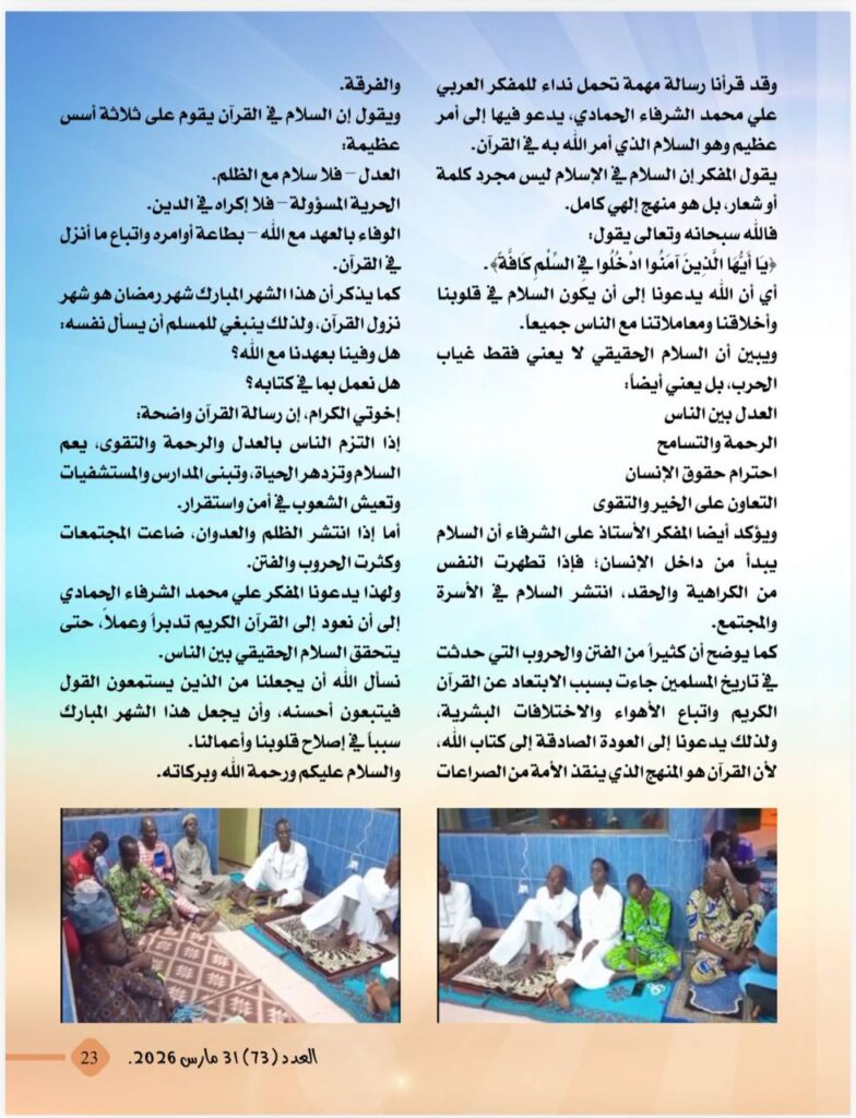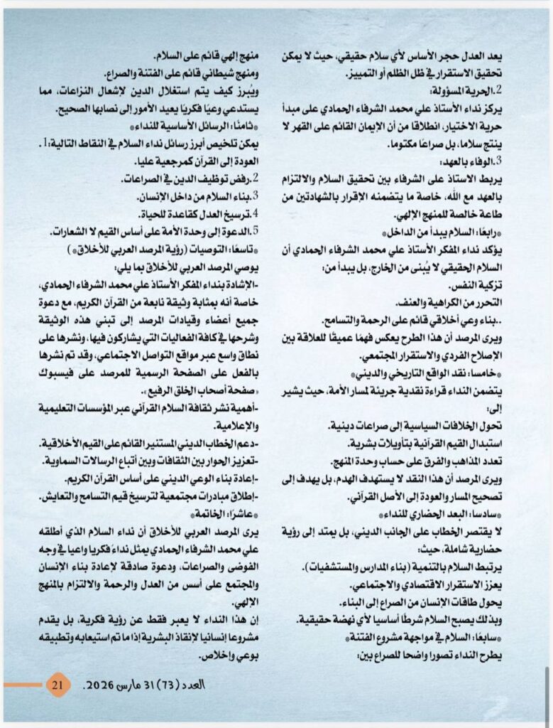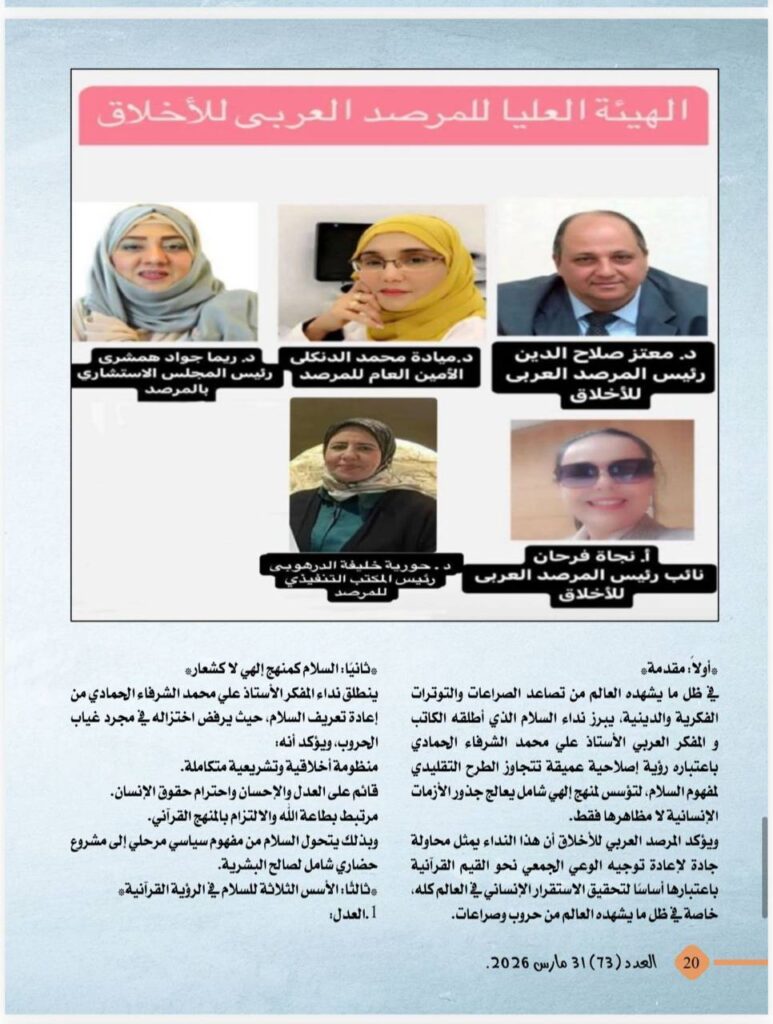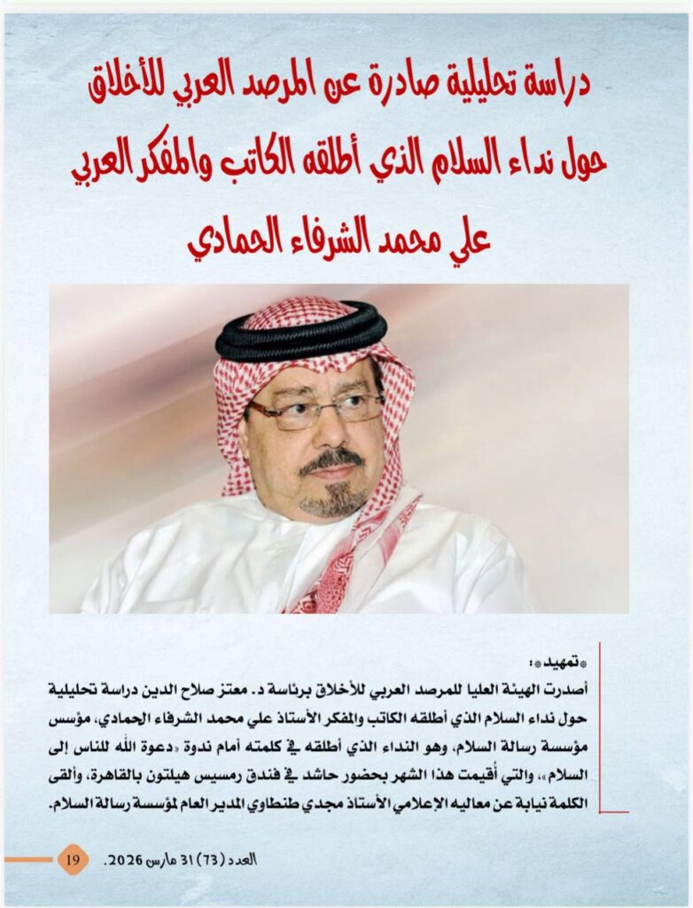 -دراسة تحليلية صادرة عن المرصد العربى للأخلاق حول نداء السلام الذى أطلقه الكاتب والمفكر العربى على محمد الشرفاء الحمادى