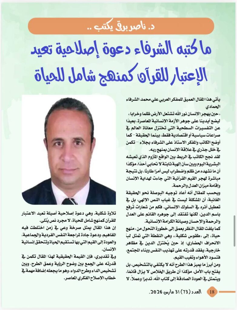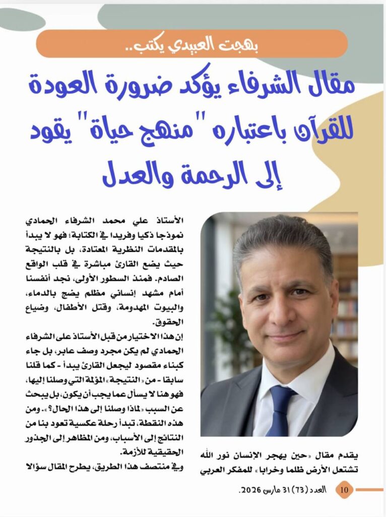 -بهجت العبيدي يكتب..مقال الشرفاء يؤكد ضرورة العودة للقرآن باعتباره منهج حياة يقود اإلى الرحمة والعدل