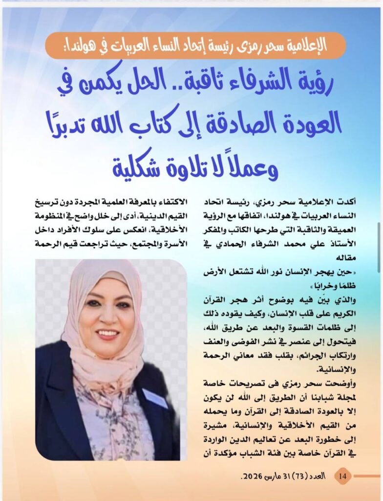 -الاعلامية سحر رمزى رئيسة إتحاد النساء العربيات في هولندا :رؤية الشرفاء ثاقبة..الحل يكمن في العودة الصادقة إلى كتاب الله تدبرا وعملا لا تلاوة شكلية