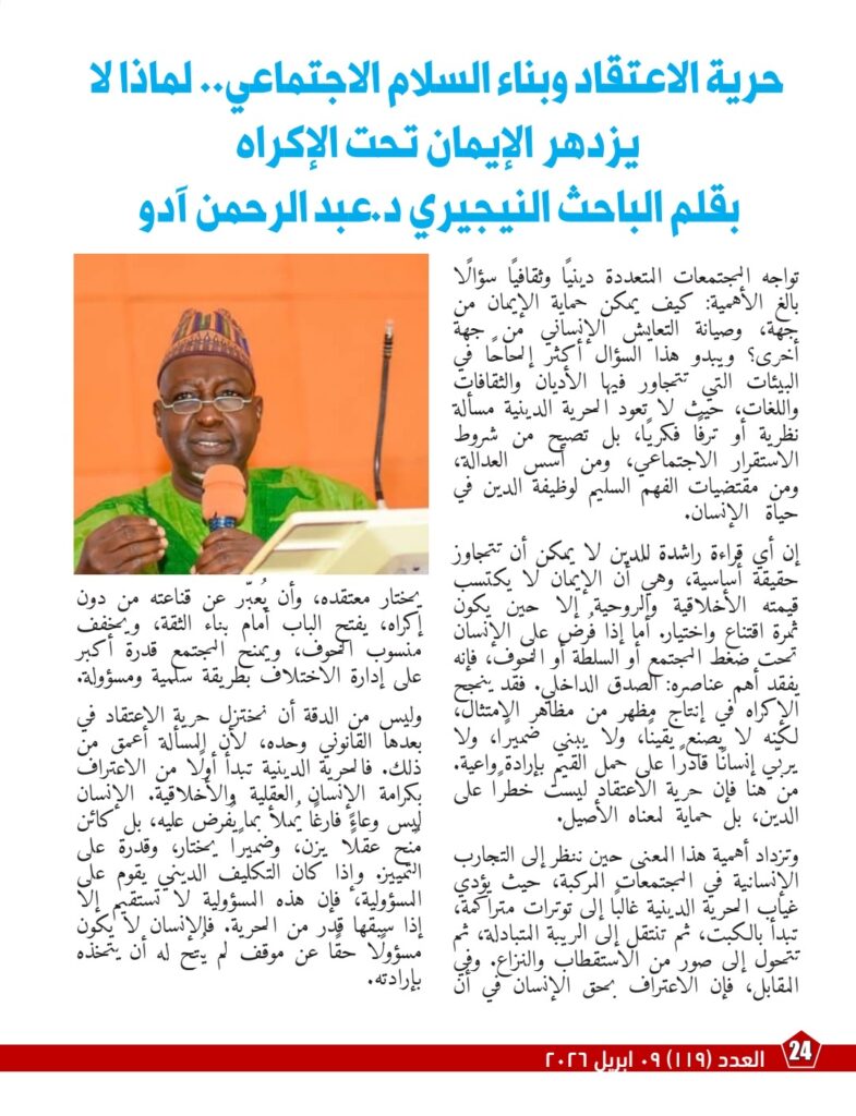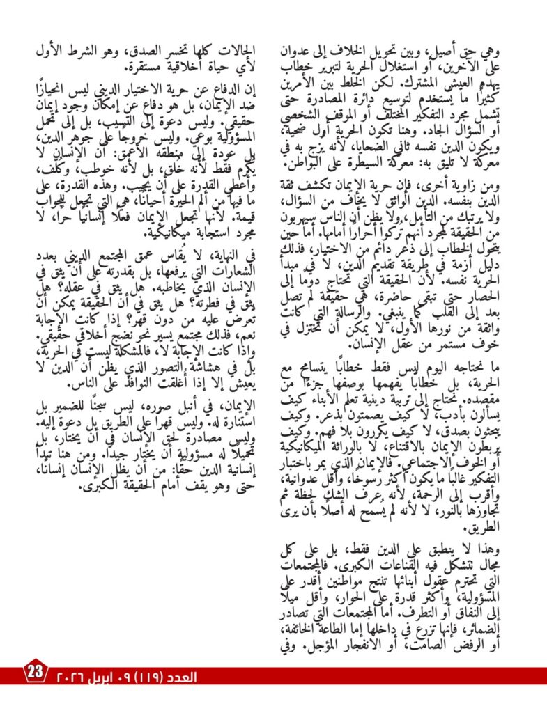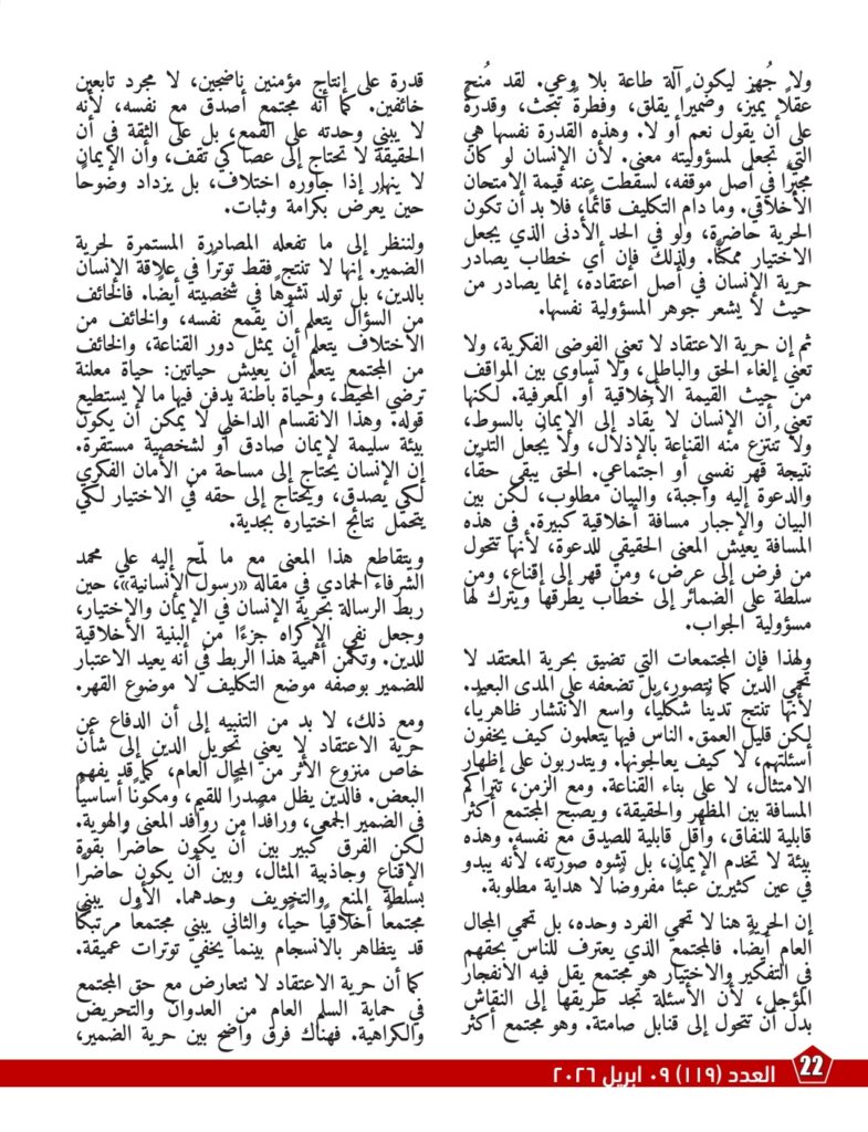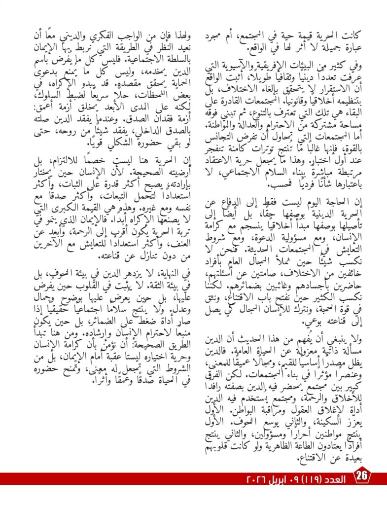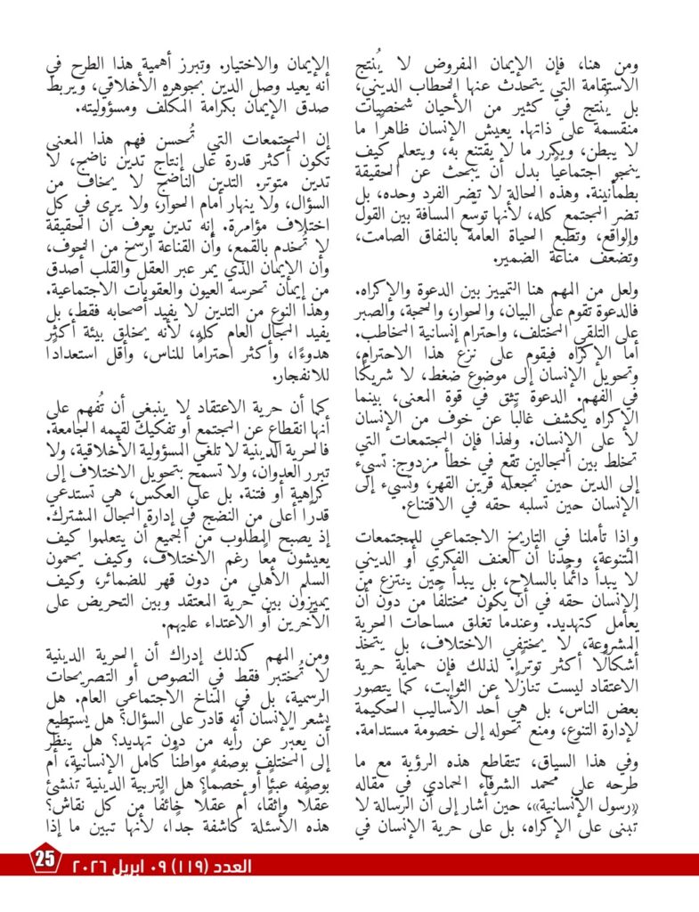 أما مقال «حرية الإعتقاد وبناء السلام الاجتماعي.. لماذا لا يزدهر الإيمان تحت الإكراه» فقد وسّع النقاش باتجاه المجال العام، رابطًا بين حرية المعتقد والاستقرار الاجتماعي، ومبينا أن المجتمعات المتعددة لا تبني سلامها بالقهر، بل بالإعتراف بالتنوع، وإحترام الضمير، وإدارة الاختلاف على قاعدة العدالة والكرامة الإنسانية.
