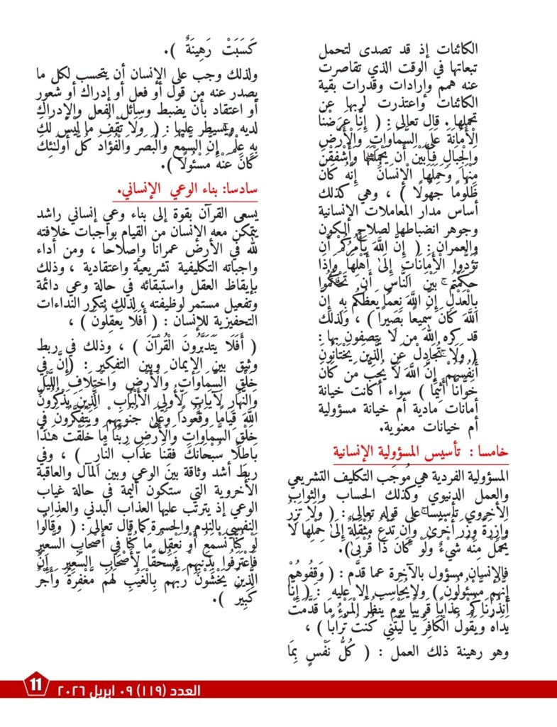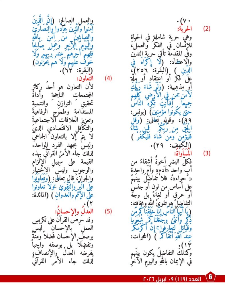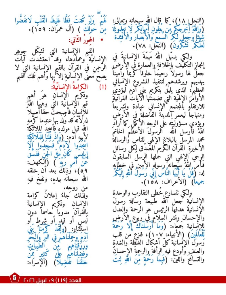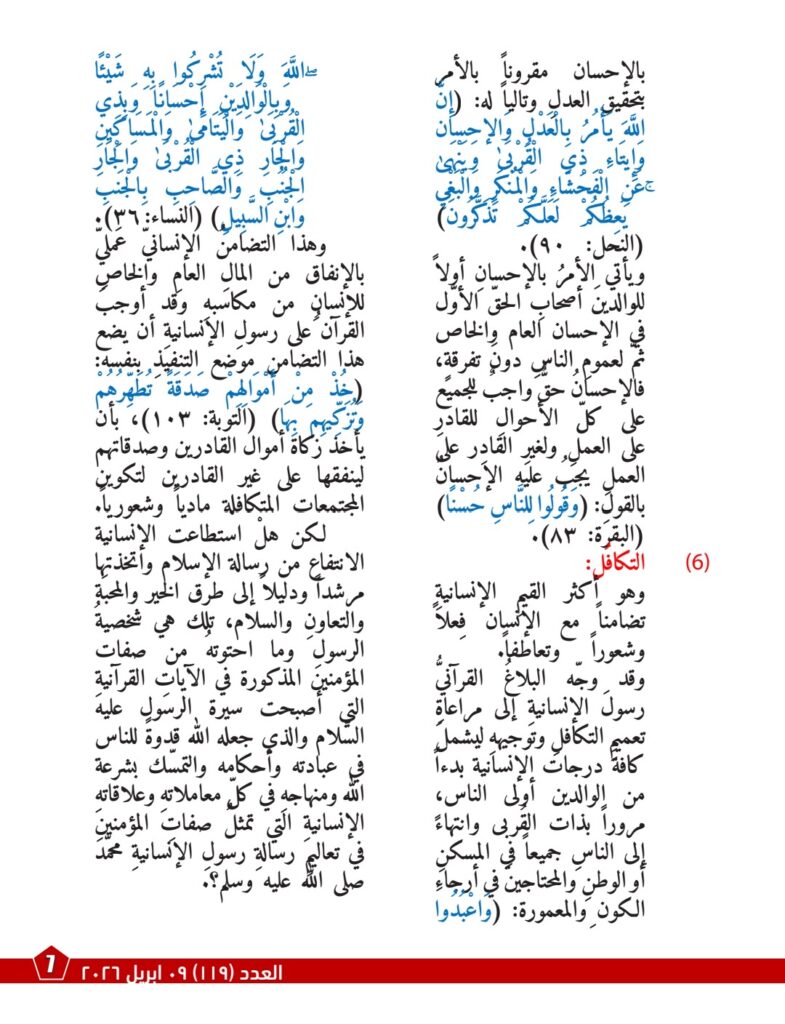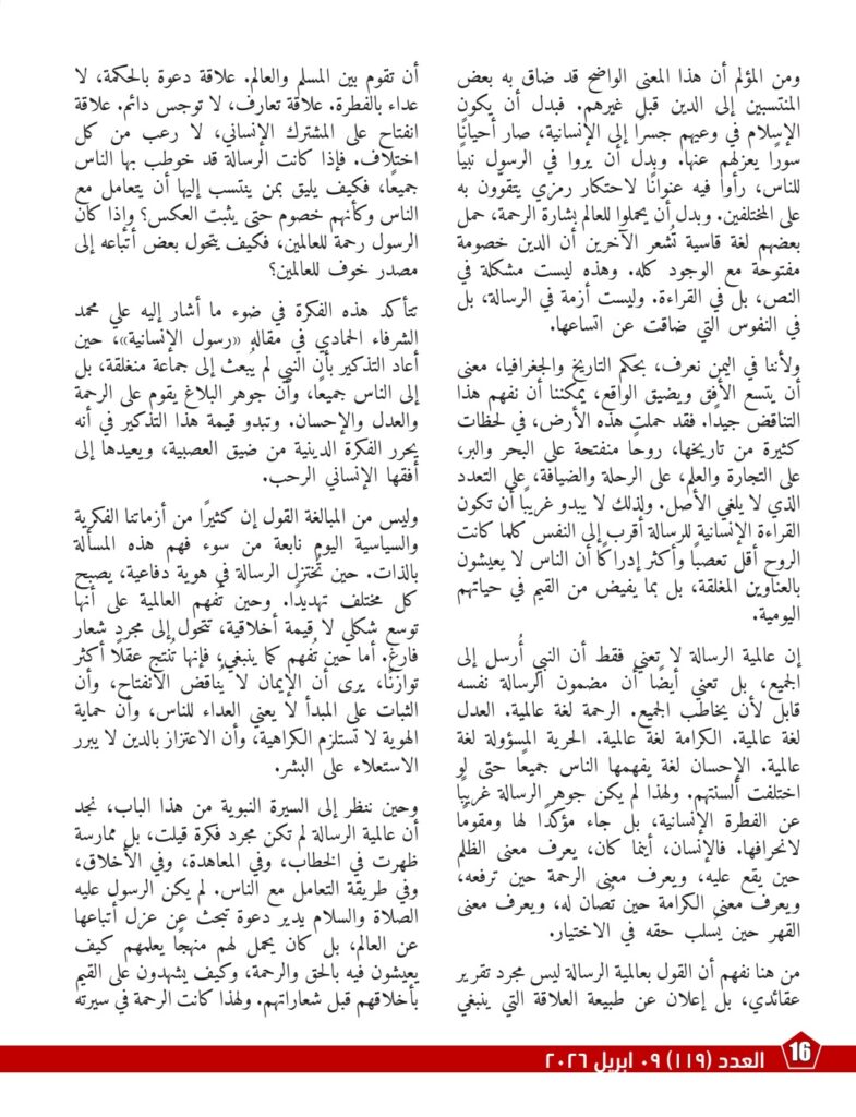 كما يتوقف المقال عند منظومة القيم الإنسانية التي يقدمها القرآن بوصفها أعمدة لقيام المجتمع الصالح، من الكرامة والحرية والمساواة إلى التعاون والعدل والإحسان والتكافل، رابطًا بين هذه القيم وبين سيرة الرسول بوصفه النموذج العملي لرسالة الرحمة. ومن هذا المنطلق، بدا المقال الافتتاحي بمثابة النص الحاكم للعدد كله، إذ وفر الأرضية الفكرية التي تحركت فوقها بقية المقالات قراءةً وتحليلًا وتوسيعًا.