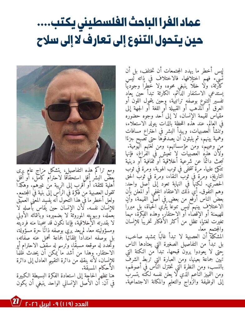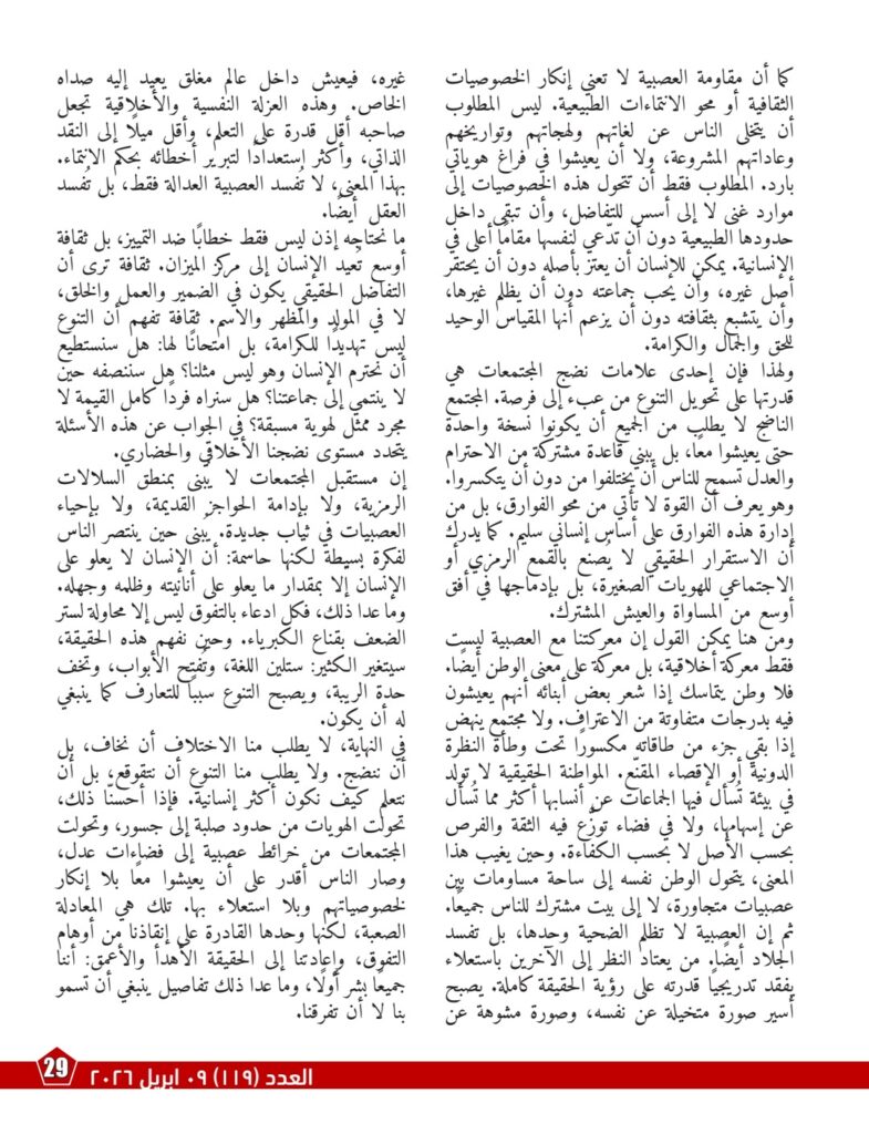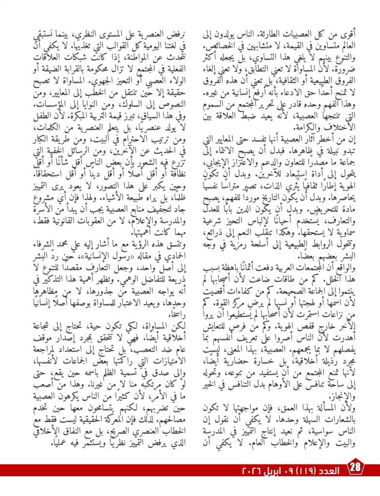 وفي مقال «حين يتحول التنوع إلى تعارف لا إلى سلاح» اتجه النقاش إلى نقد العصبيات وأوهام التفوق، مع التأكيد أن التنوع الإنساني ليس مدخلا للصدام بل فرصة للتعارف، وأن المساواة الحقيقية لا تعني إلغاء الفروق، بل منع تحويلها إلى ذرائع للاستعلاء أو الإقصاء أو التمييز.