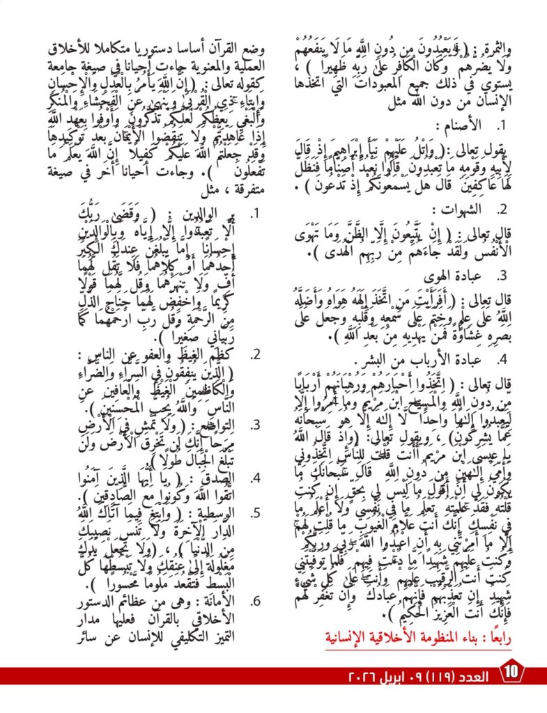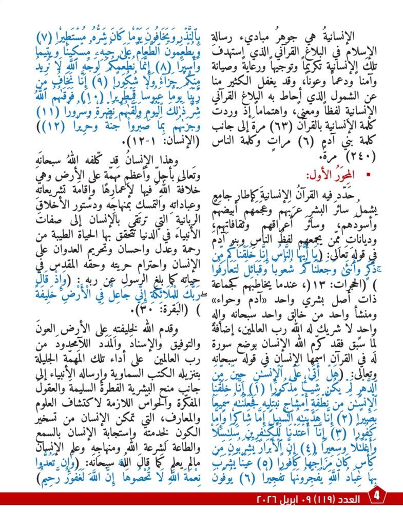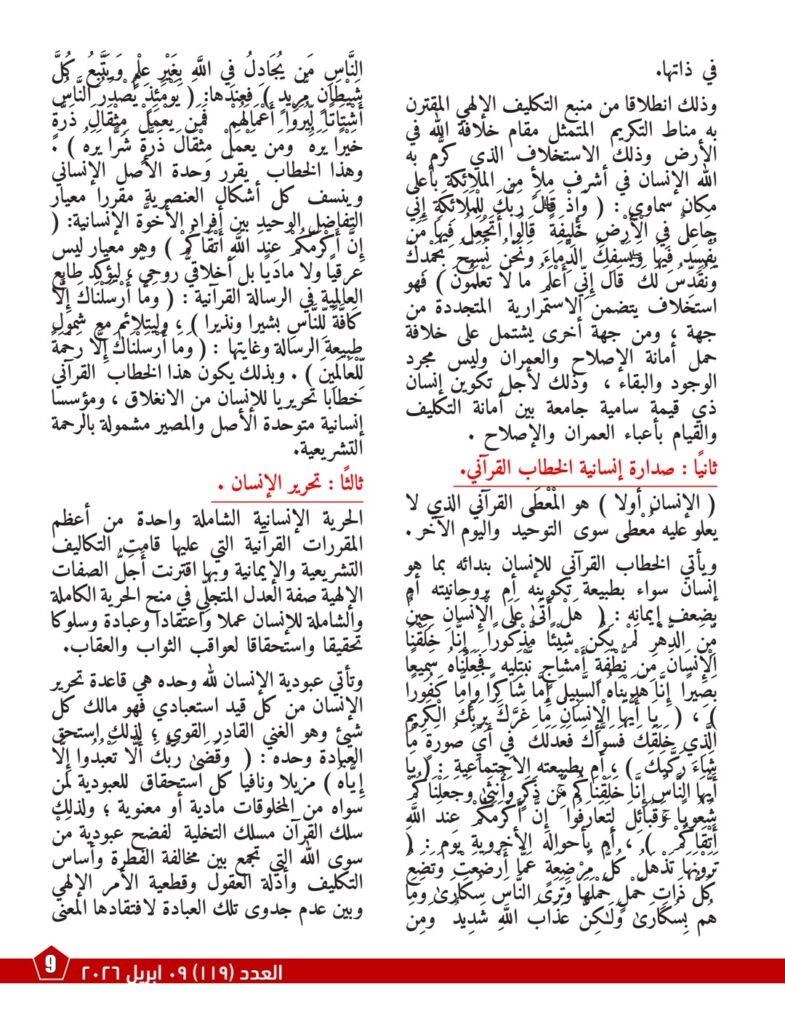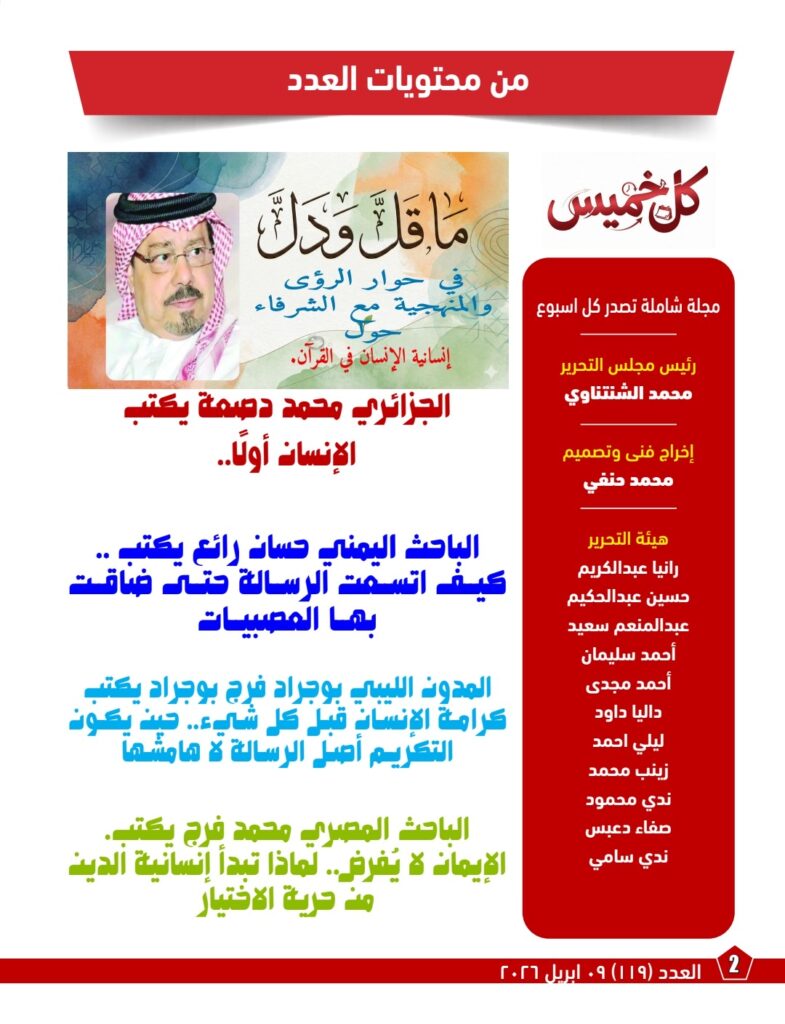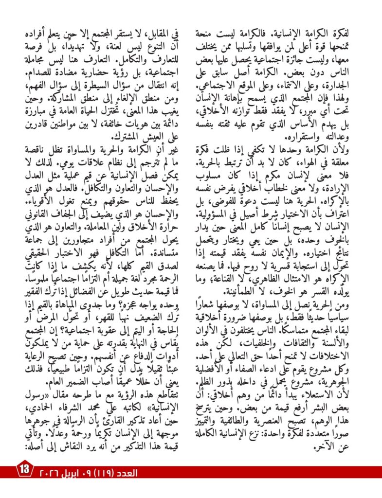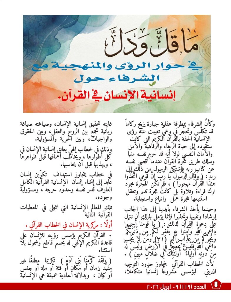 وجاء العدد هذه المرة بوصفه ملفًا فكريًا متكاملًا، إنطلق من رؤية المفكر الاستاذ على الشرفاء للإنسانية في الخطاب القرآني، ثم توسع عبر مقالات متعددة ناقشت الفكرة نفسها من زوايا فكرية وثقافية واجتماعية متنوعة، بما منح العدد ثراء خاصًا ووحدة موضوعية واضحة.