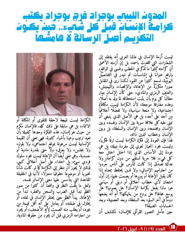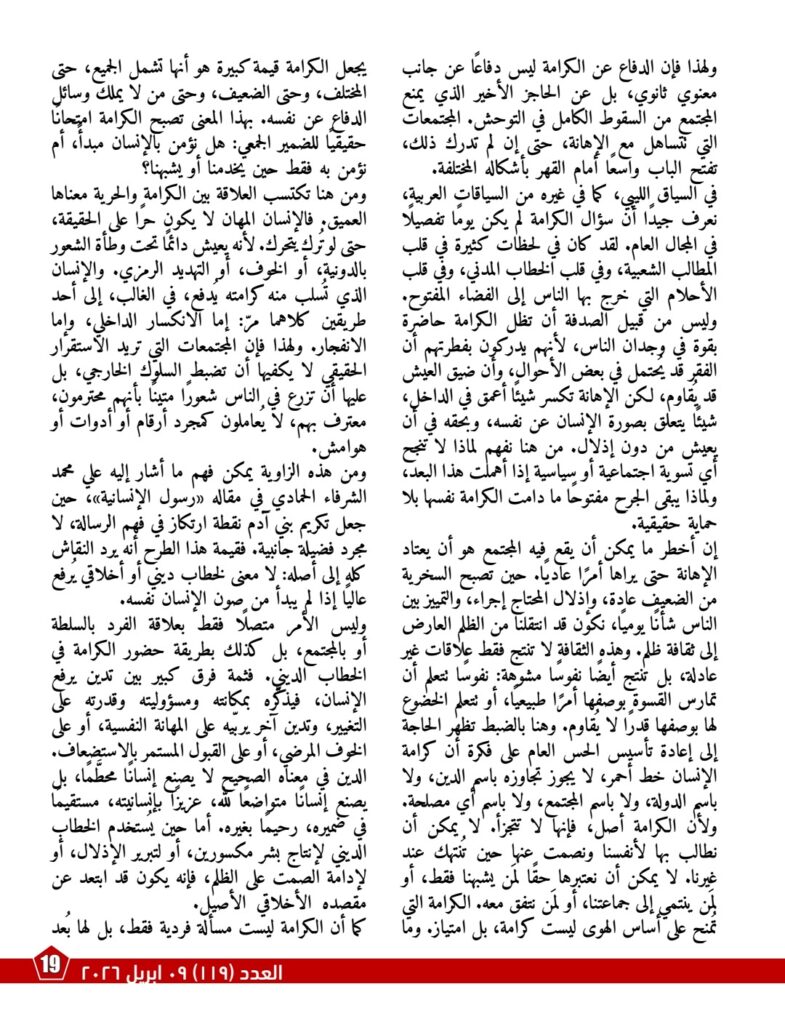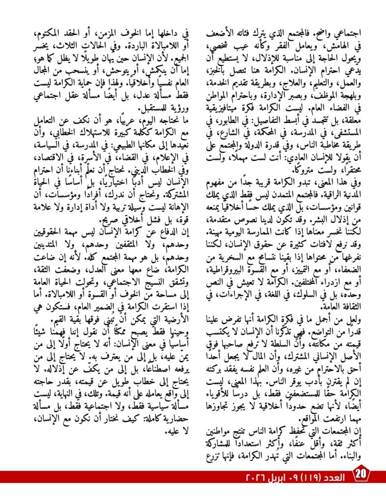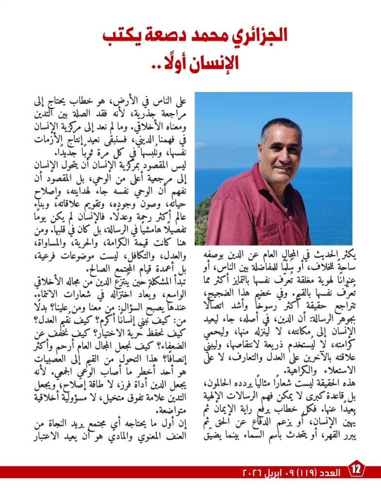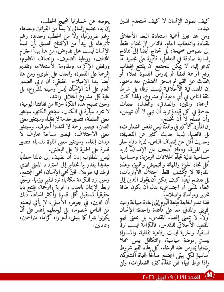 أما مقال «الإنسان أولًا» فقد إنشغل بتأكيد مركزية الإنسان في فهم الرسالة، وناقش كيف يتحول الدين من طاقة إصلاح إلى أداة فرز حين يُنتزع من مجاله الأخلاقي الواسع، داعيًا إلى رد الاعتبار للكرامة والحرية والمساواة والتكافل بوصفها شروطًا لازمة لبناء مجتمع سليم.