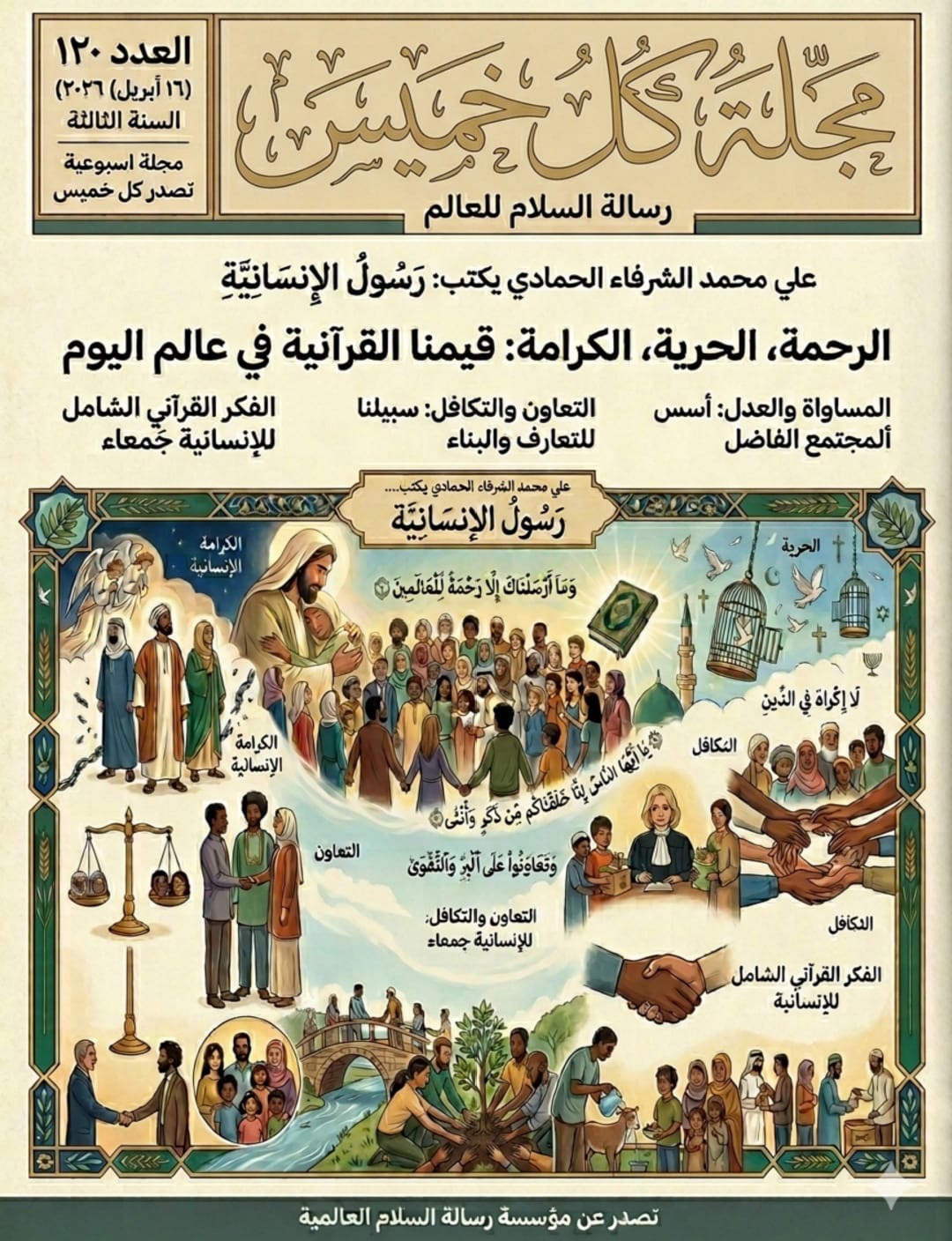 ويطرح مقال علي محمد الشرفاء الحمادي «رسول الإنسانية» رؤية مركزية مؤداها أن الإنسانية ليست قيمة هامشية في الرسالة الإسلامية، بل هي جوهرها الأصيل كما يقدمه البلاغ القرآني؛ إذ يؤسس المقال لفهمٍ يرى الإنسان مكرمًا من الله، مخاطبًا بالرحمة، ومكلفًا بالإعمار والإصلاح، في إطار من الحرية والعدل والتعارف. ويعيد المقال التذكير بأن الرسالة الخاتمة لم تُبعث لتضيق على الناس، بل لتفتح أمامهم أفقًا إنسانيًا رحبًا يقوم على الرحمة والكرامة والتكافل.