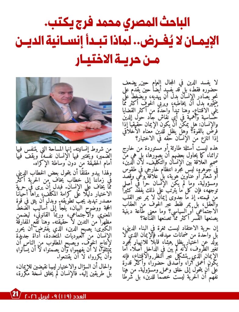 وفي مقال «الإيمان لا يُفرض.. لماذا تبدأ إنسانية الدين من حرية الاختيار» انصبت المعالجة على العلاقة بين الإيمان والحرية، مع تأكيد أن الإيمان الحقيقي لا يولد تحت الإكراه، وأن حرية الإعتقاد ليست خروجا على الدين، بل ضمانة لصدقه وعمقه الأخلاقي، وأن القناعة أرسخ من الامتثال القسري.