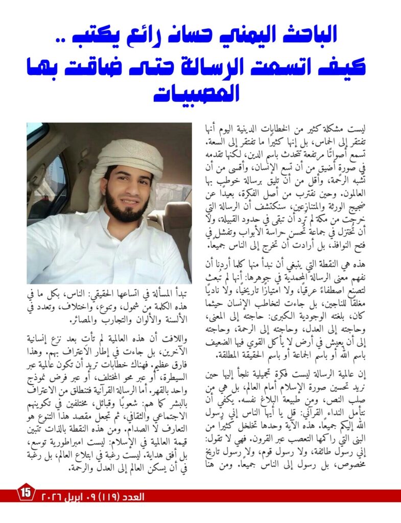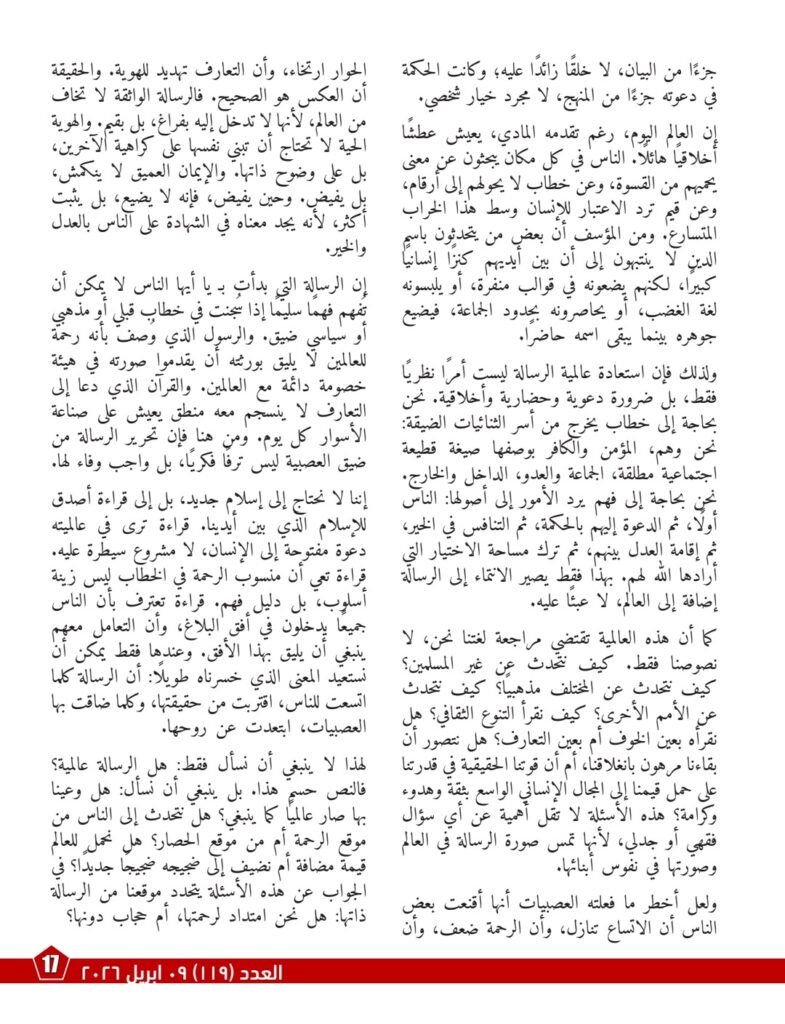 وفي مقال «كيف اتسعت الرسالة حتى ضاقت بها العصبيات» برز التركيز على عالمية الرسالة الإسلامية، وعلى الفارق بين خطاب قرآني مفتوح على الناس جميعًا، وبين قراءات ضيقة حوّلت هذا الاتساع إلى أسوار من العصبية والانغلاق، مؤكدًا أن جوهر الرسالة أفق هداية ورحمة لا مشروع هيمنة أو إقصاء.