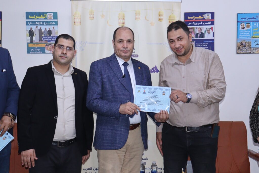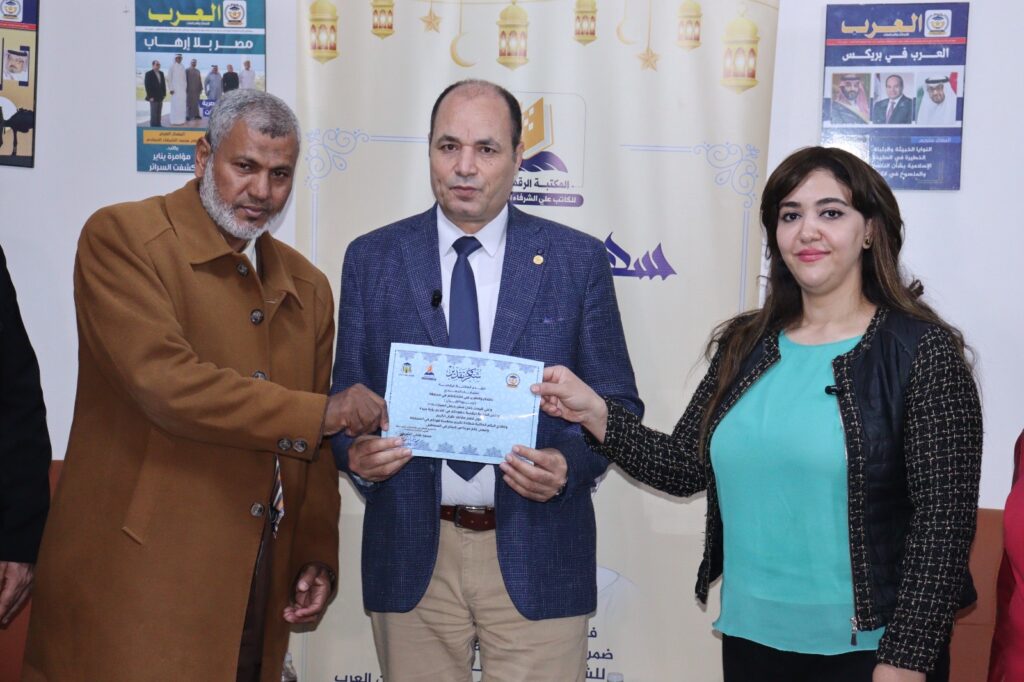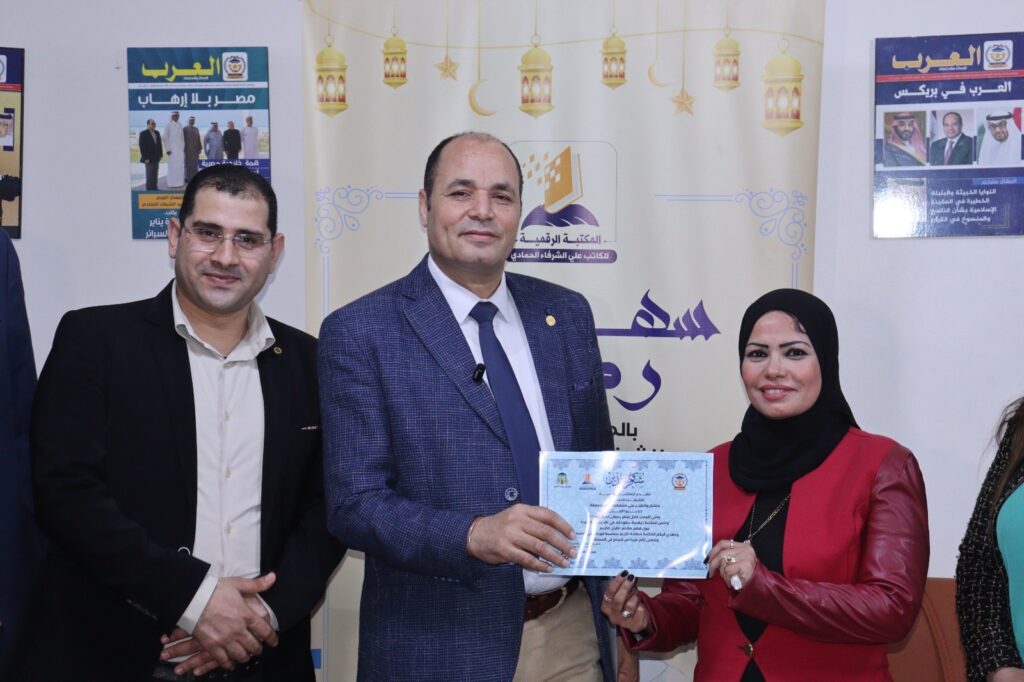 كرم مسؤولو مركز العرب للأبحاث والدراسات؛ محمد فتحي الشريف رئيس المركز، والدكتورة دينا محسن مدير المركز، وعبد الغني دياب رئيس تحرير المركز، فريق عمل “المكتبة الرقمية للشرفاء الحمادي”، وذلك لجهودهم المتميزة خلال شهر رمضان والتي عقدت خلالها سبع ندوات فكرية استضافت عدداً كبيراً من الباحثين والسياسيين والمفكرين، منهم الدكتور أحمد ترك رئيس اللجنة الدينية بمجلس الشيوخ المصري، والصحفي رضا سلام، والصحفي محمد الجوهري، والأستاذ الدكتور عبد الراضي رضوان، عضو مؤسسة رسالة السلام، والكاتب هشام النجار عضو مؤسسة رسالة السلام، والباحث السوري أحمد شيخو، ونخبة من القامات الوطنية والثقافية.